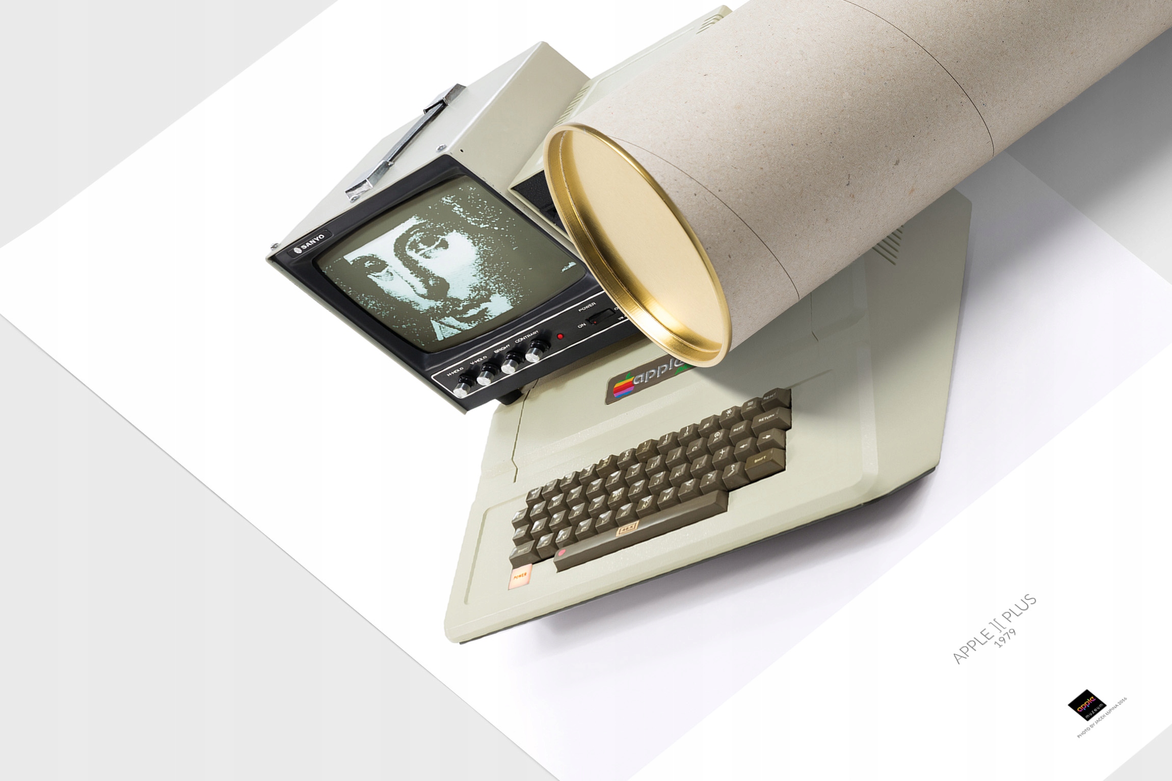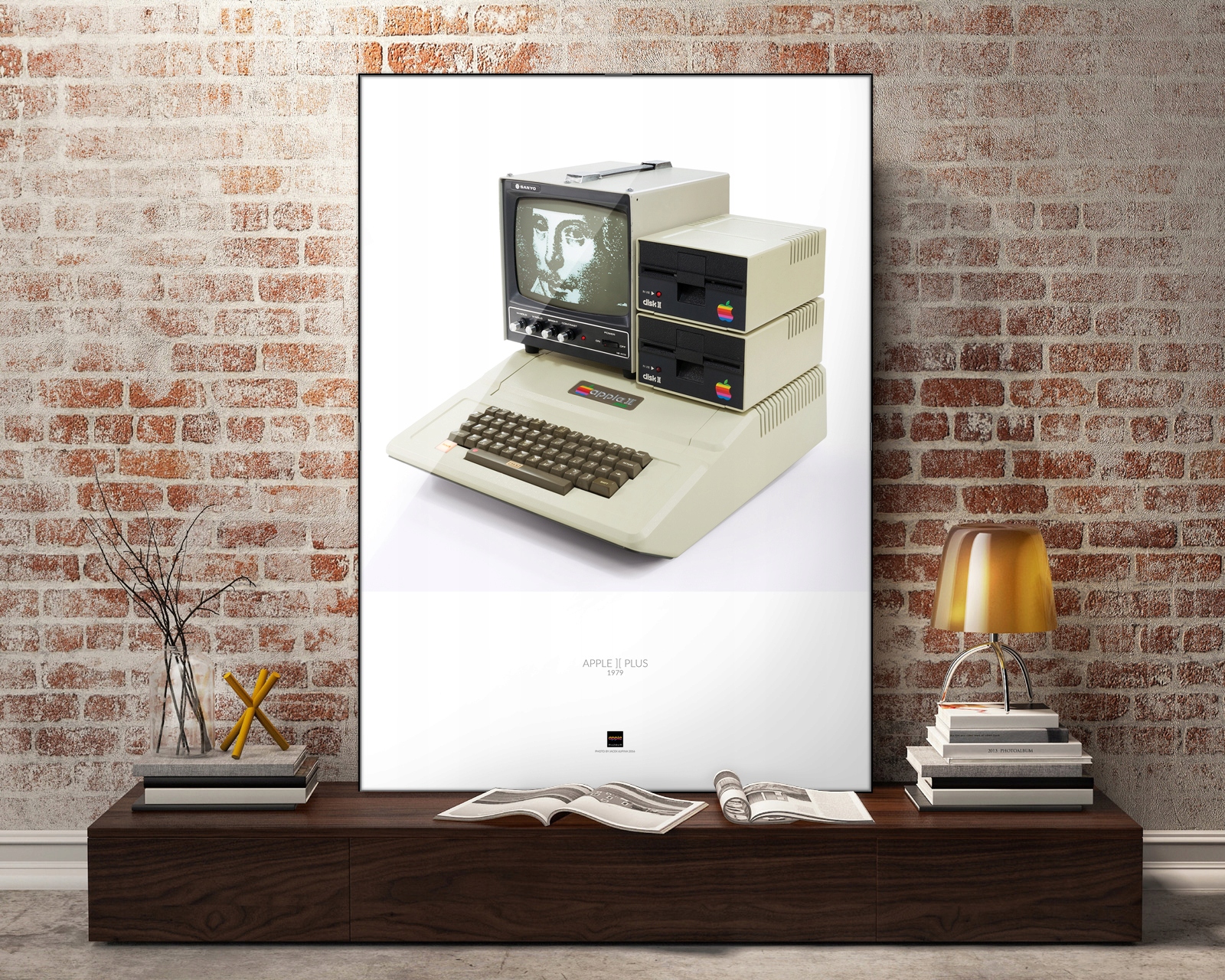 Plakat w formacie pionowym przedstawia zdjęcie komputera Apple II PLus z 1979 roku.