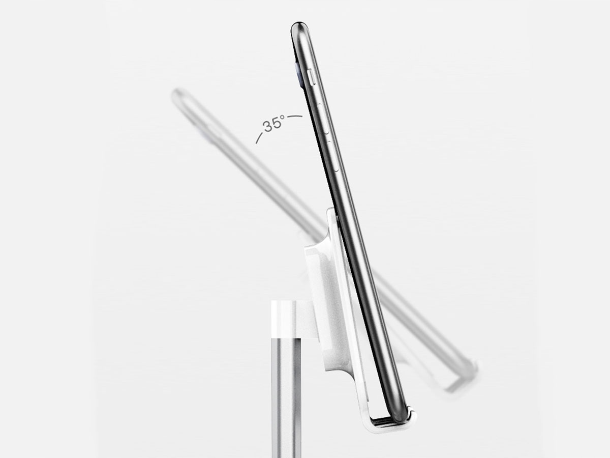 Kolejnym atutem podstawki jest jej funkcjonalność. Uchwyt na telefon posiada możliwość zmiany wysokości (teleskopowa) oraz zmiany kąta nachylenia urządzenia włożonego w uchwyt aż do 35 stopni.