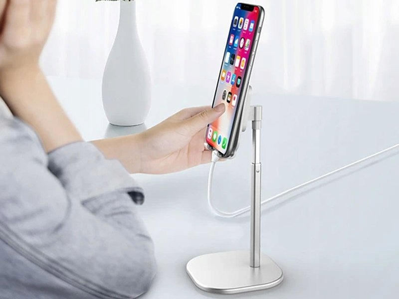 Podstawka na telefon jest zaprojektowana tak, aby nie przysłaniać w pełni podstawy urządzenia, gdzie najczęściej znajdują się sloty na ładowarkę lub słuchawki, dzięki temu, możemy podczas trzymania telefonu na podstawce, jednocześnie ładować urządzenie lub słuchać muzyki przez słuchawki.