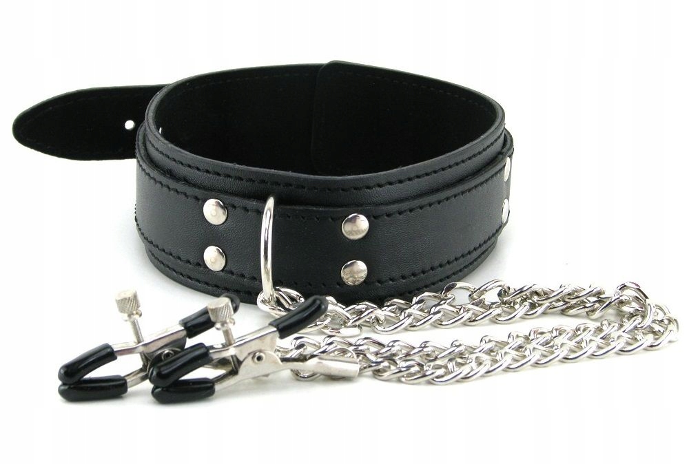 Skórzana obrożna na szyję wraz z łańcuszkami zakończonymi zaciskami na sutki. Zaciski posiadają profesjonalną regulację nacisku, dzięki czemu mogą bardzo delikatnie naciskać na sutki zapewniając komfort podczas noszenia, lub mocno zaciskać się sprawiając ból, w zależności od upodobań użytkownika. Produkt kierowany do miłośników BDSM.