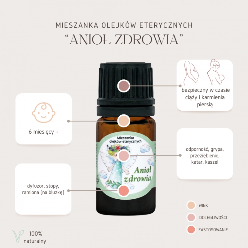„Anioł Zdrowia” to olejek eteryczny, który może być bezpiecznie stosowany już u niemowląt od 6. miesiąca życia, co czyni go wyjątkowym na rynku produktów aromaterapeutycznych. Jest to doskonały wybór dla rodzin z małymi dziećmi, które uczęszczają do przedszkoli i szkół, gdzie kontakt z wirusami i bakteriami jest nieunikniony. Olejek ten może być również używany przez dorosłych, którzy pragną wzmocnić swoją odporność, a także przez osoby wrażliwe, które często odczuwają dyskomfort z powodu intensywnych zapachów innych olejków.