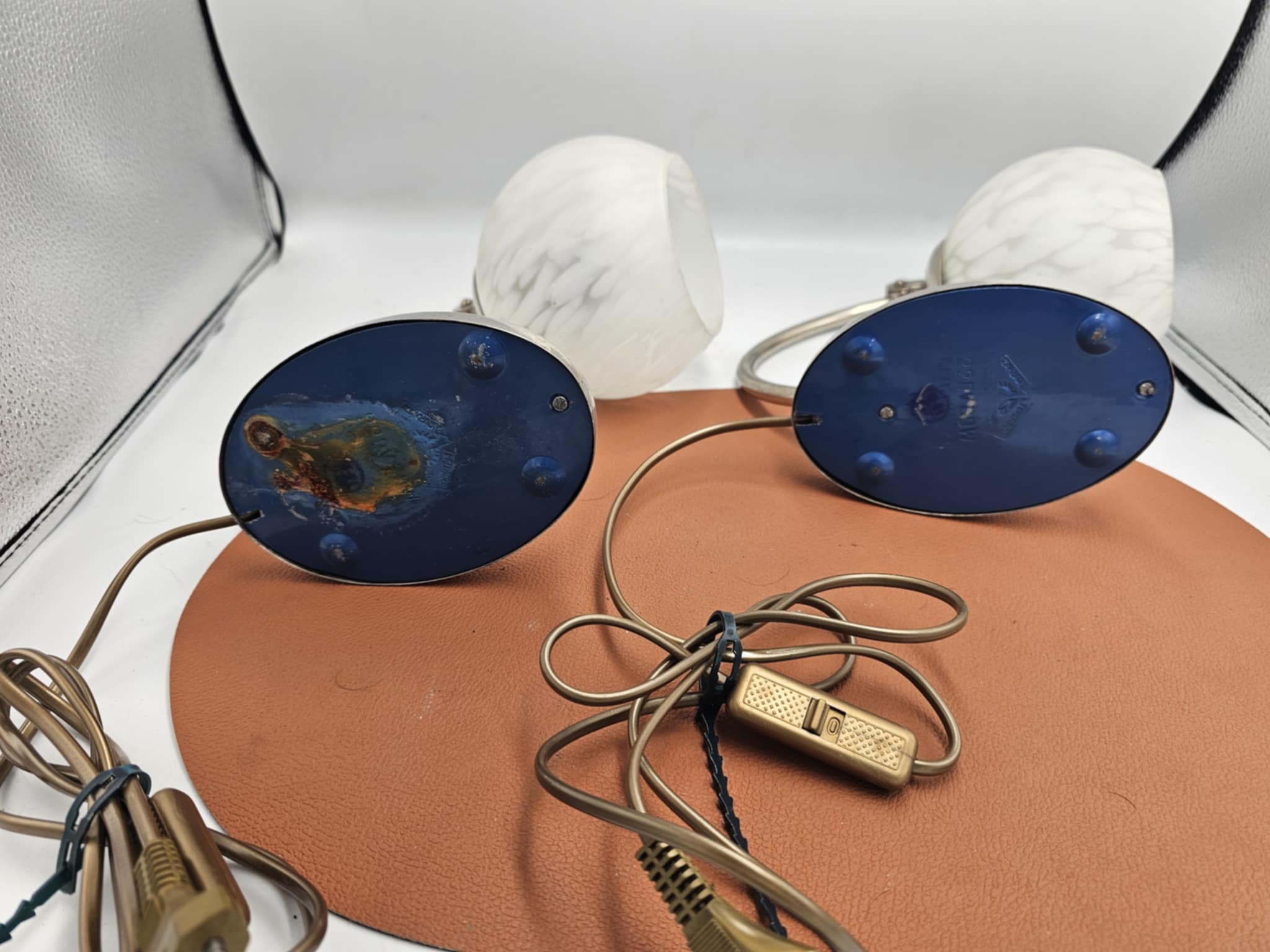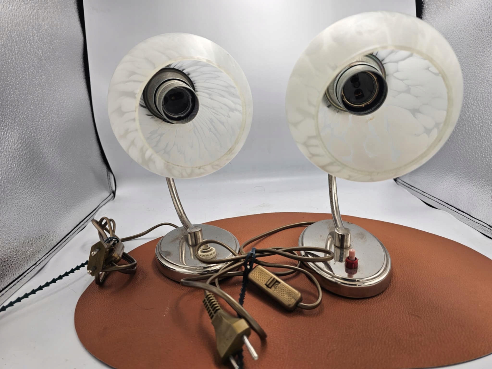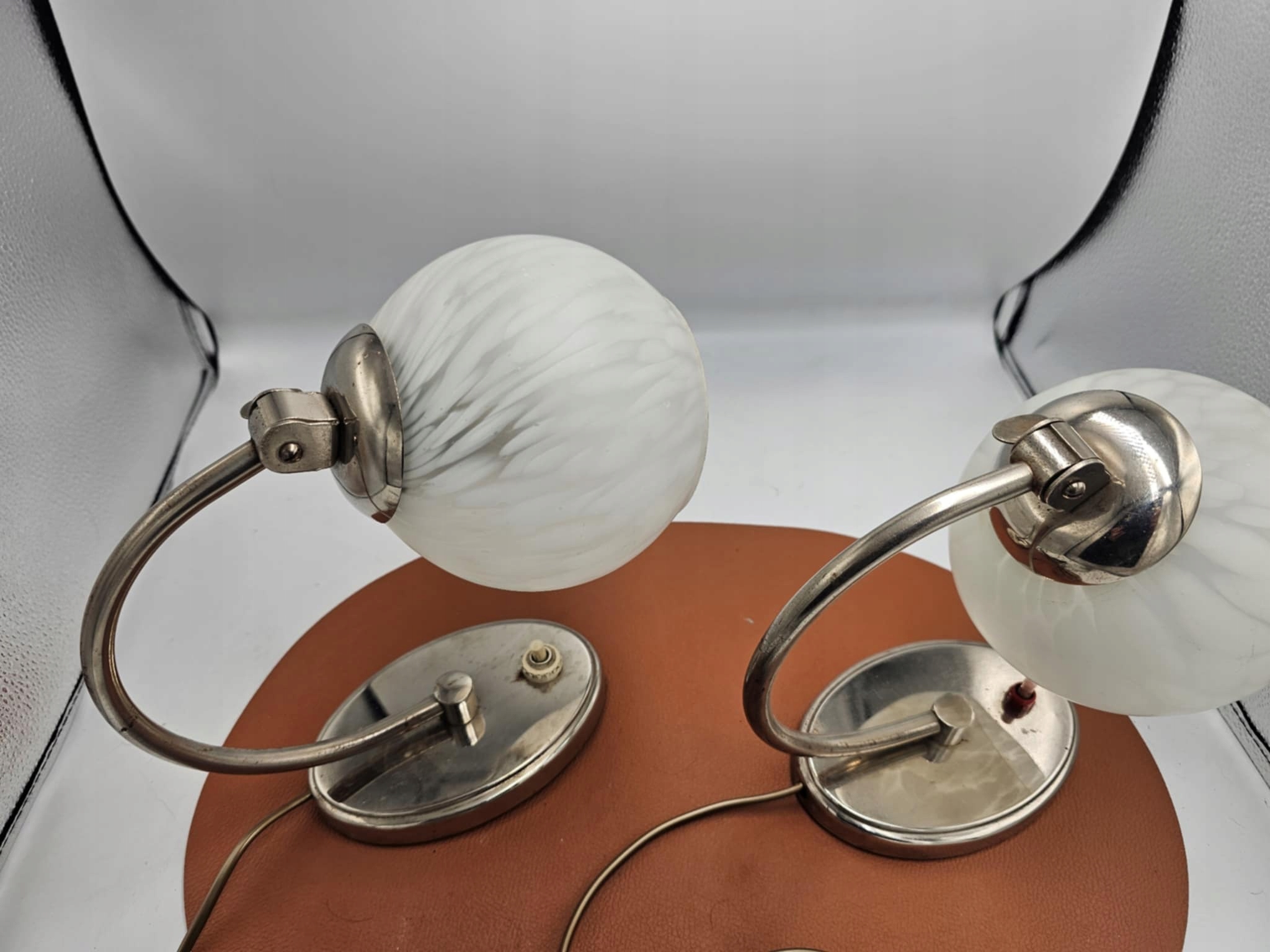 Art deco,komplet 2 szt.niklowane lampki z lat 50,Zakład Terenowy Częstochowa,klosze z huty Zawiercie,cena dotyczy kompletu czyli 2 sztuk,wymiary:wys.23 cm.szer.18 cm.gł.22 cm.podstawa 14,5 cm. x 9,8 cm.śr.klosza 12,5 cm.,na innych moich aukcjach znajdziesz inne lampki,klosze oraz wszystko co ci potrzebne do lamp,lampek,żyrandoli,kinkietów,lamp naftowych,zobacz inne moje aukcje,wystawiam ok.5000 aukcji,wszystko jak na zdjęciach