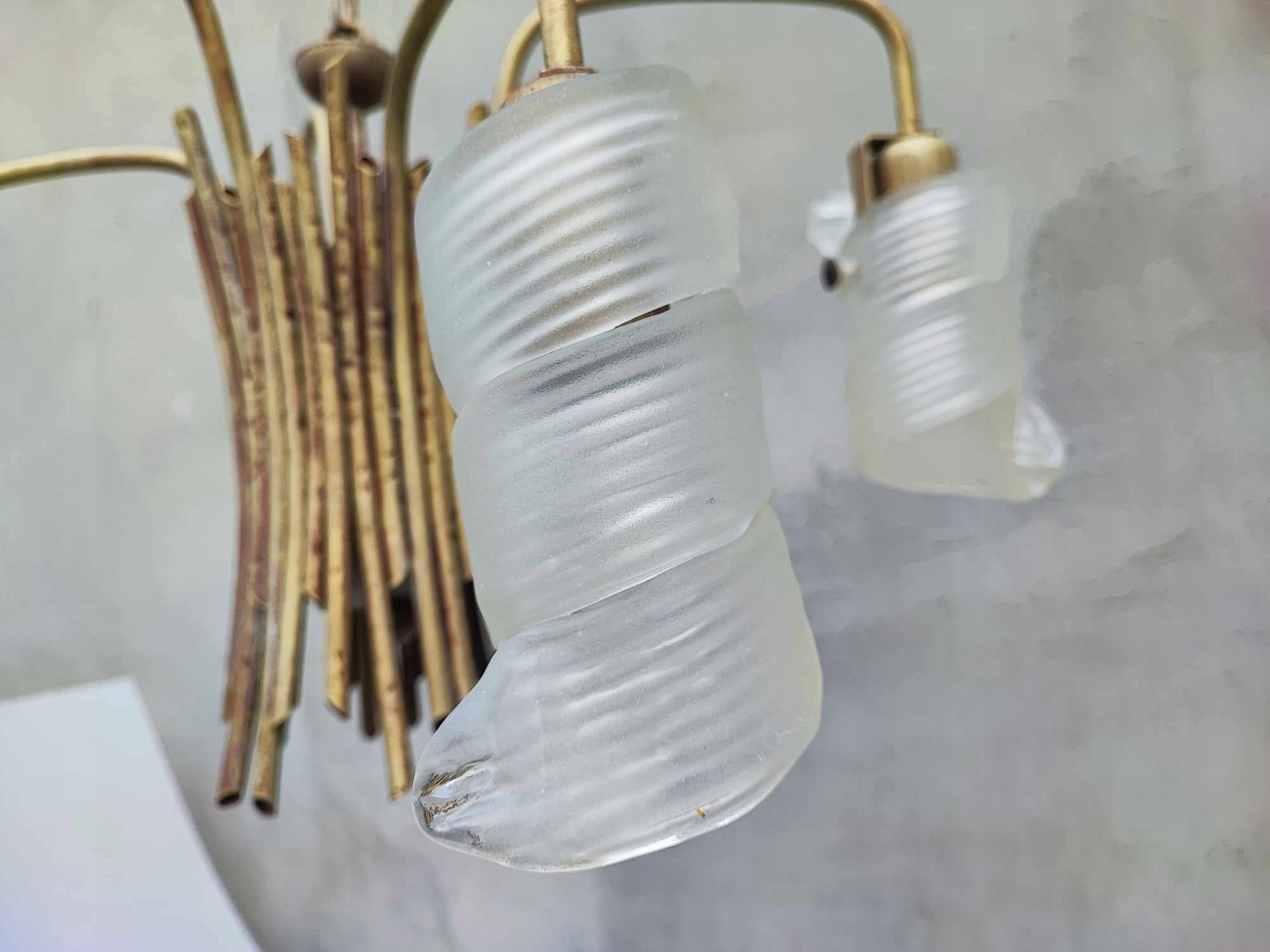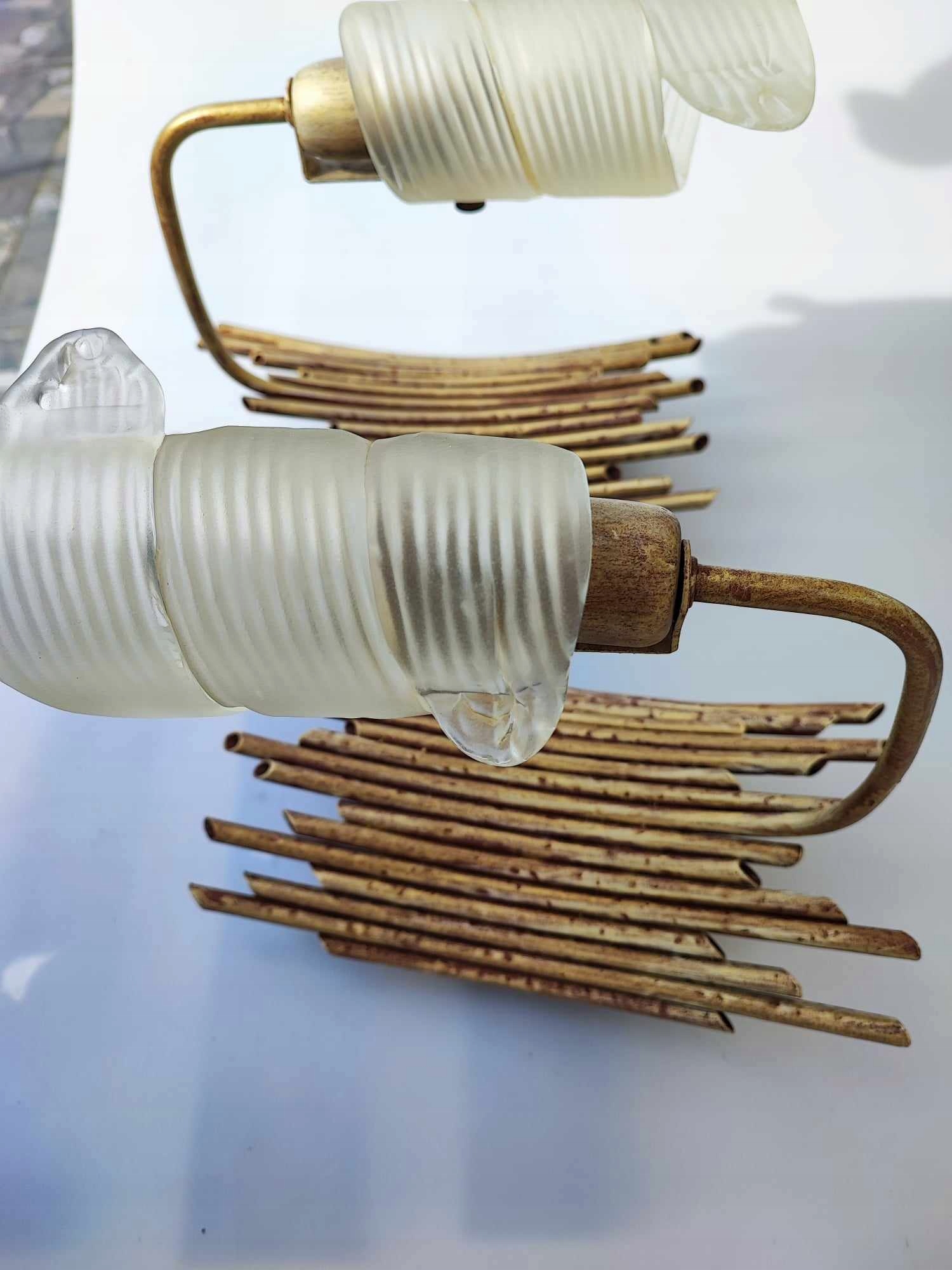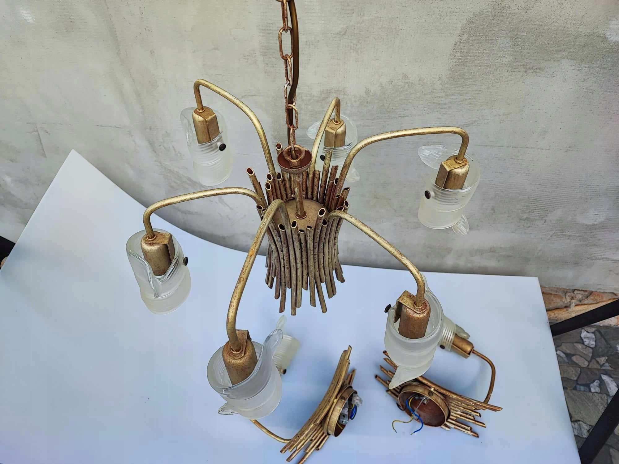 Żyrandol + 2 kinkiety,vintage lat 70-80,żyrandol i kinkiety-metalowe w kształcie patyczków z drewna,klosze szklane,wymiary-wys.57 cm.rozpiętość-ok.50 cm.2 kinkiety mają po szer.13 cm.wys.27 cm.gł.25 cm.,oprawki na żarówki E27,idealny dla designera z tych lat,na wystrój,do filmu itp.,na innych moich aukcjach znajdziesz inne żyrandole,kryształki,aplikacje,kilimy,szyldy klamki,szyldy do mebli,karnisze,klosze oraz wszystko co ci potrzebne do lamp,lampek,żyrandoli,kinkietów,lamp naftowych,zobacz inne moje aukcje,wystawiam ok.5000 aukcji,wszystko jak na zdjęciach