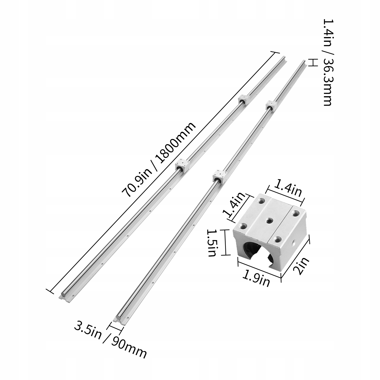 Zestaw ślizgów liniowych SBR: zestaw ślizgów liniowych SBR20-1800mm zawiera 2 sztuki ślizgów SBR20 o długości 1800mm i 4 sztuki bloków ślizgowych SBR20UU. Obciążenie dynamiczne na blok: 882 N Obciążenie statyczne na blok: 1370 N.