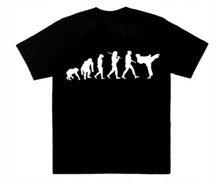 Połączenie 100% bawełny z gramaturą 190g / m3 tworzy doskonałą, wysokiej jakości całość naszych koszulek. Czarny T-shirt z umieszczonym, popularnym nadrukiem EWOLUCJA to minimalistyczny set, który świetnie sprawdzi się podczas treningu.