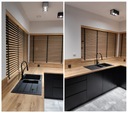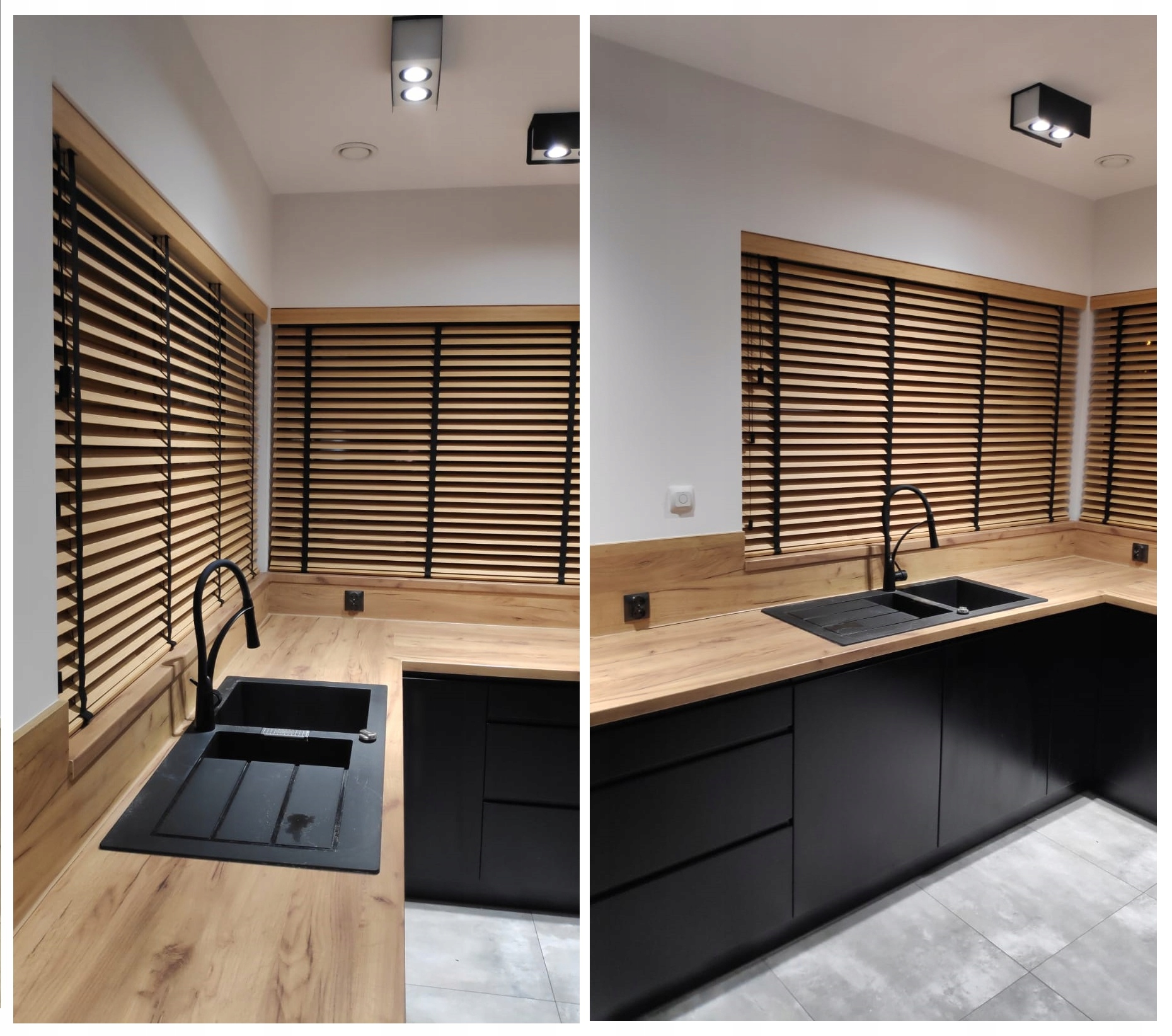 Żaluzje drewniane robią niesamowite wrażenie zamontowane w dużych kuchniach połączonych z salonem.