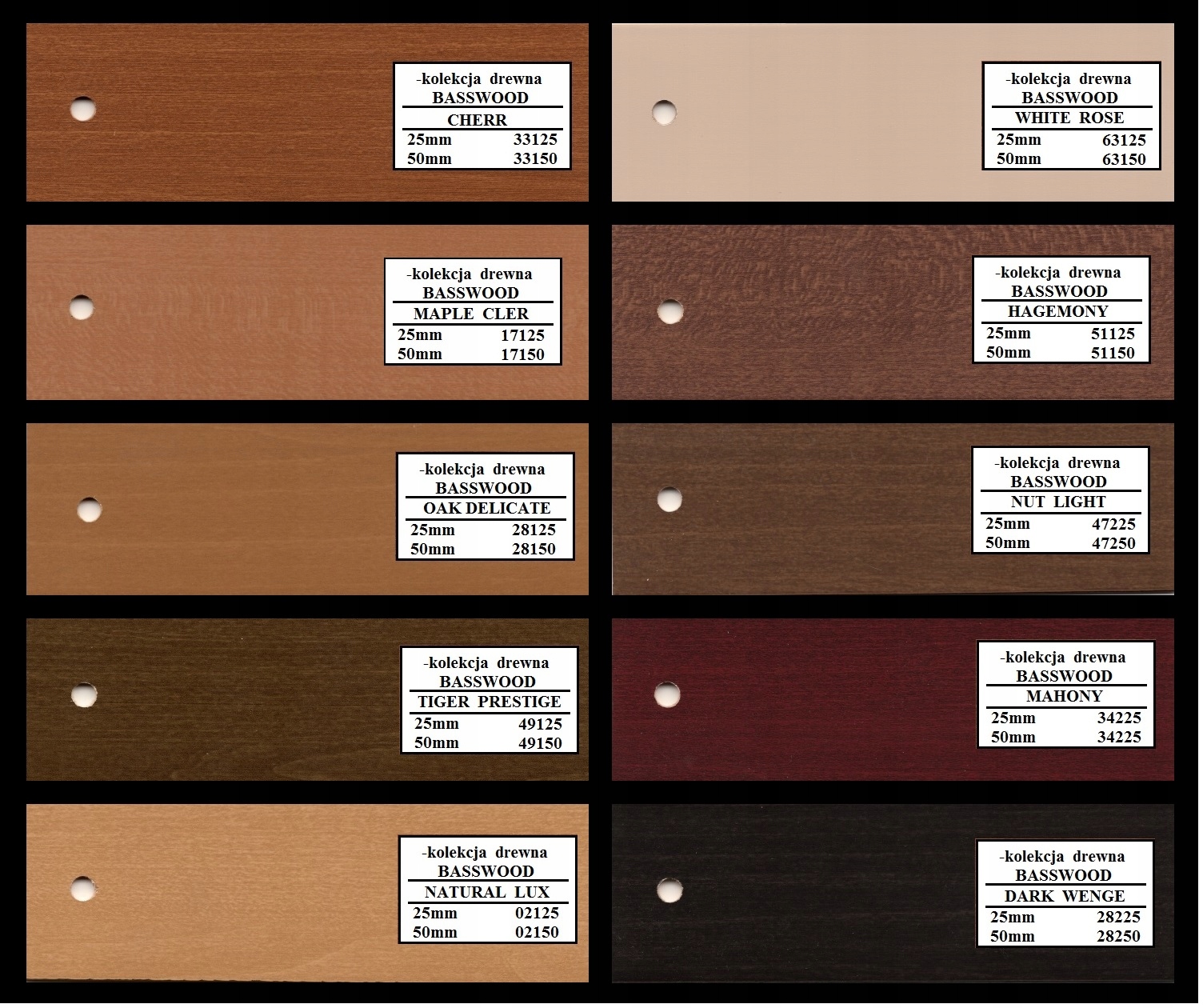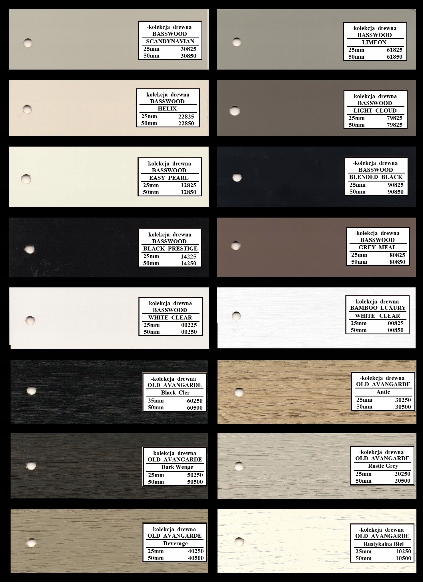Zapraszamy do zapoznania się z kolorystyką dostępną na tej aukcji. Przedstawiamy Państwu 30 dostępnych kolorów lameli drewnianych i bambusowych.