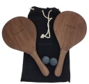Zestaw dwóch rakiet w klasycznym drewnianym brązie są połączone z dwoma grafitowymi kulkami, tworząc podwyższony, trwały sprzęt plażowy.