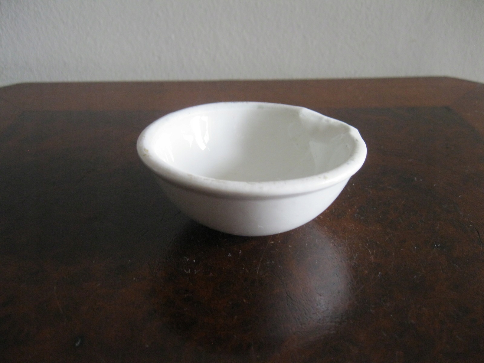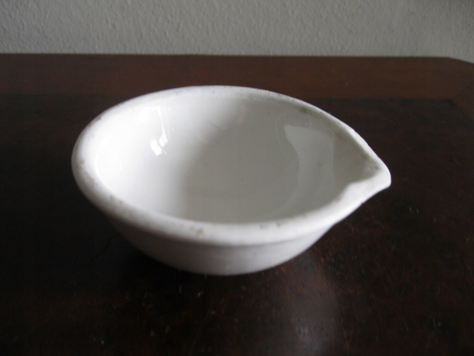 Oryginalna, nieduża kokilka - tajemnicza miseczka apteczna z dziobkiem - Chodzież. Wykonana z dobrej jakości, solidnej ale lekkiej porcelany w kolorze białym, bez żadnych zdobień, krawędź kokilki nieszkliwiona. Zachowana w stanie bardzo dobrym minus, w okolicach dziobka posiada dwa odpryski szkliwa od spodu jeden bardzo maleńki, praktycznie niewidoczny tylko wyczuwalny, drugi bardziej widoczny, trochę większy. Sygnowana. Polecam !