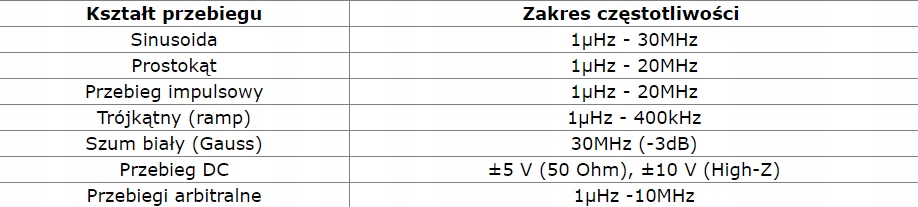 - różnorodne kształty przebiegów: sinusoidalny, prostokątny, trójkątny, trapezowy, hałasowy, impulsowy, DC