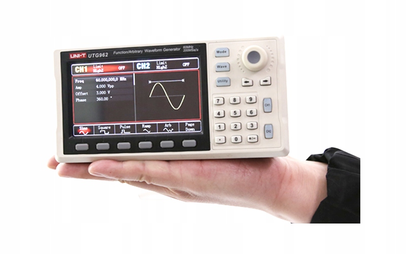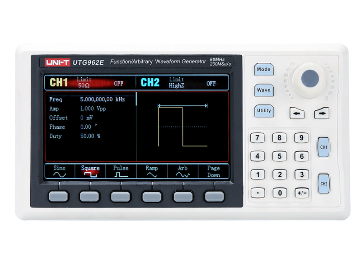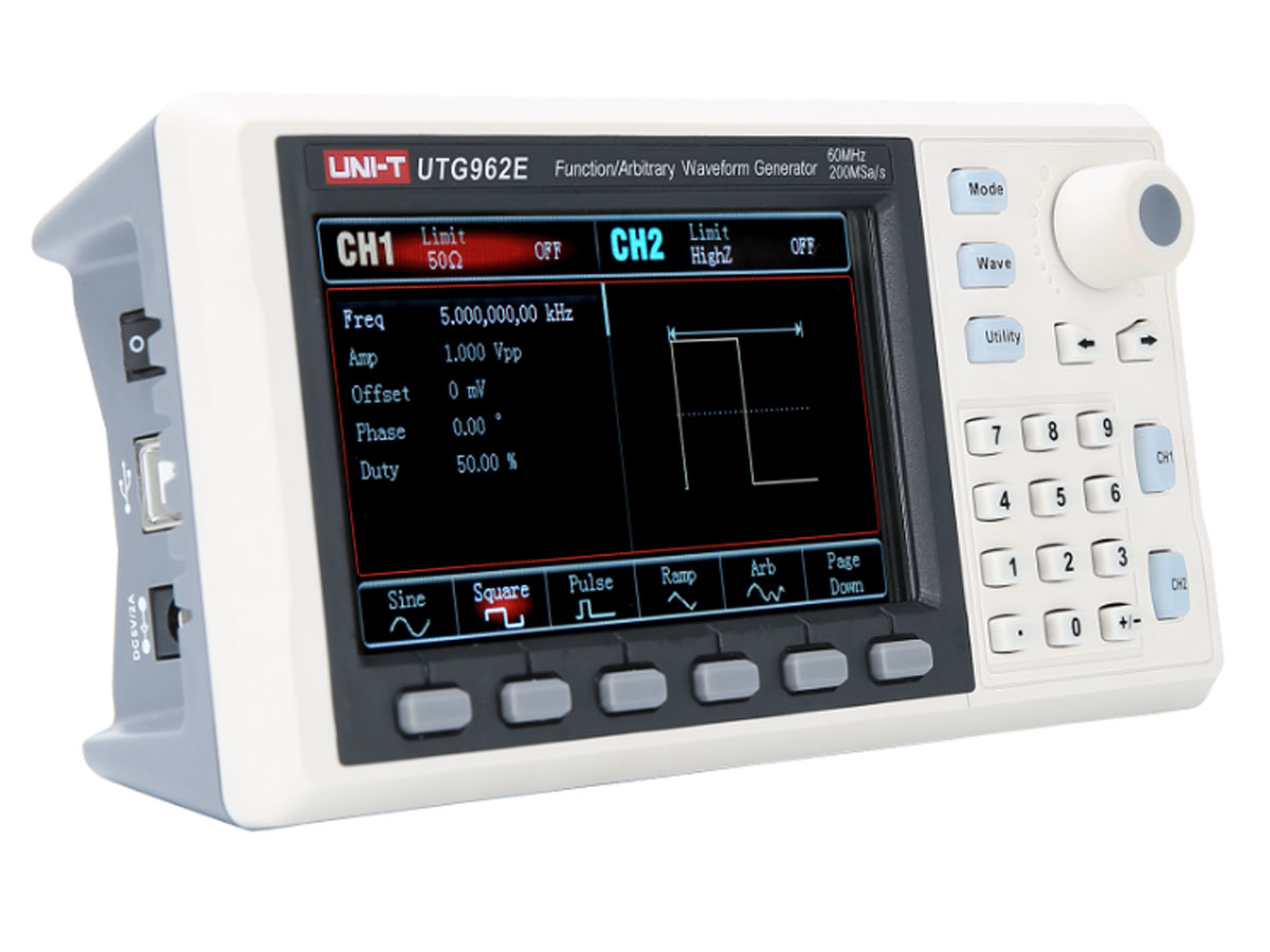 Uni-T UTG932E to wszechstronny generator funkcji i arbitralny, który zapewnia szerokie możliwości generowania różnorodnych przebiegów. Dzięki szerokości pasma wynoszącej 30MHz oraz rozdzielczości regulacji częstotliwości na poziomie 1µHz, użytkownik ma precyzyjną kontrolę nad generowanymi sygnałami. Posiadając dwie kanały, długość przebiegu sięgającą 4kpts oraz rozdzielczość pionową 14 bitów. Generator umożliwia dokładne tworzenie różnorodnych sygnałów, w tym sinus, prostokąt, trójkąt, impuls, szumu, DC oraz przebiegów arbitralnych. Dzięki różnorodnym trybom pracy, takim jak SWEEP, modulacja i wyjście bramkowane, oraz typom modulacji obejmującym AM, FM, PM, FSK, UTG932E dostarcza elastyczność do realizacji różnorodnych zastosowań. Zapewnia również precyzyjne kontrolowanie amplitudy generowanych przebiegów w zakresie od 1mVpp do 10Vpp, przy zachowanej impedancji wyjściowej na poziomie 50 Ohm. Dodatkowe funkcje, takie jak sygnał synchronizacji Sync o zakresie od 1uHz do 2MHz, zabezpieczenie kanału przed przeciążeniem oraz komórki pamięci na 24 przebiegi arbitralne, sprawiają, że UTG932E jest kompletnym narzędziem do generowania sygnałów. Dodatkowo, czytelny wyświetlacz LCD TFT o rozdzielczości 480 x 272 pikseli oraz intuicyjny interfejs użytkownika zapewniają wygodną obsługę. Możliwość tworzenia przebiegów arbitralnych za pomocą oprogramowania na komputerze, złącze USB do komunikacji z komputerem oraz standardowe złącza BNC do podłączenia wyjścia generatora sprawiają, że UTG932E jest niezawodnym narzędziem dla profesjonalistów, którzy wymagają precyzji i wszechstronności w generowaniu sygnałów.