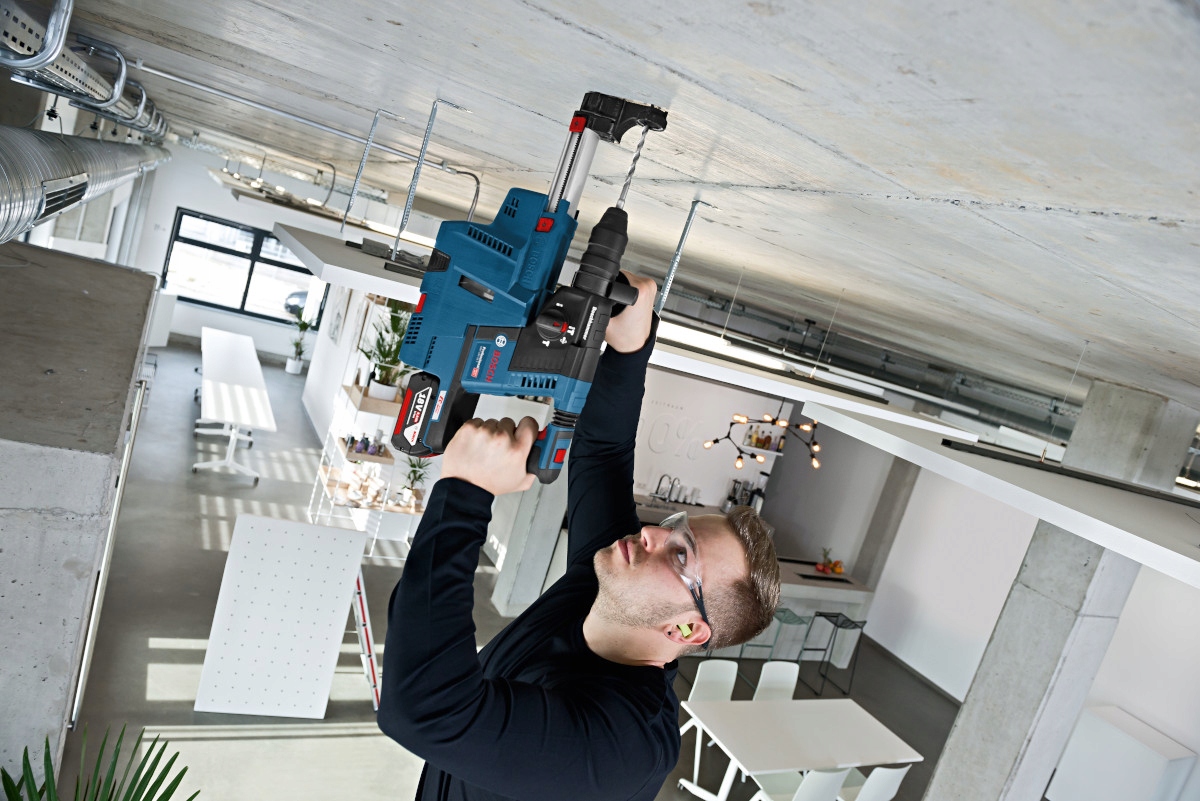 Specjalne złącze do podłączenia systemu odsysania pyłów GDE 18V-16 BOSCH pozwala na szybkie przezbrojenie urządzenia w młotowiertarkę ze zintegrowanym systemem odsysania pyłów, montaż i demontaż systemu odbywa się bez użycia dodatkowych narzedzi. Wentylator systemu zasilany jest akumulatorem zamontowanym w młotowiertarce, a wbudowany filtr HEPA sprawia, że podczas wiercenia aż 99,97% cząsteczek o średnicy powyżej 0,3 mikrometra jest pochłaniane i magazynowane w pojemniku.