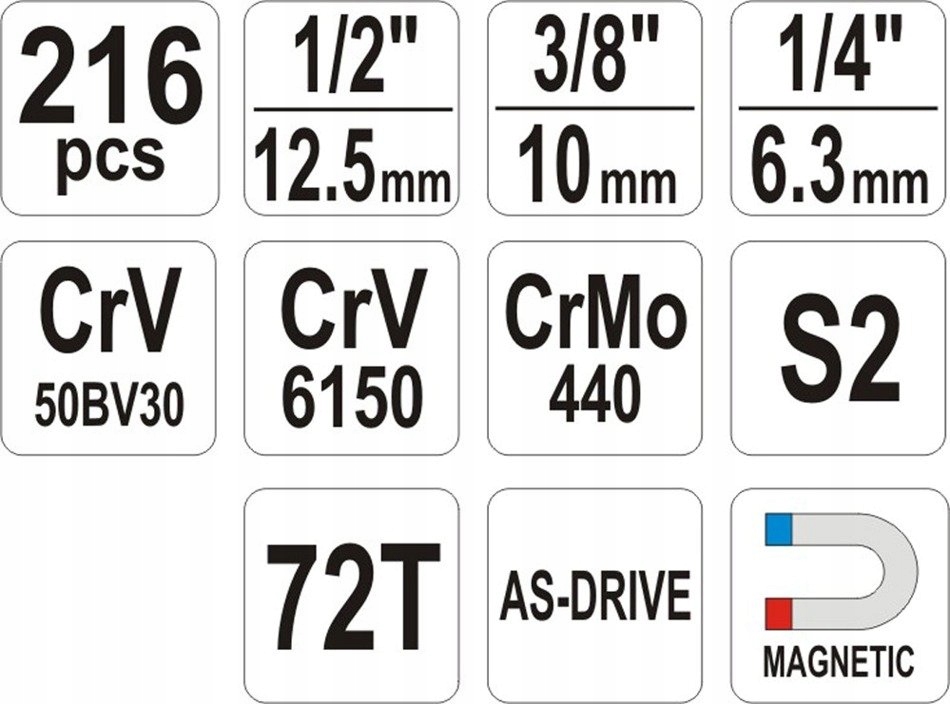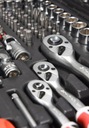 Klucze nasadowe, jak i napęd nasadek, zostały wykonane z wytrzymałej, narzędziowej stali chromowo-wanadowej CrV 50BV3.