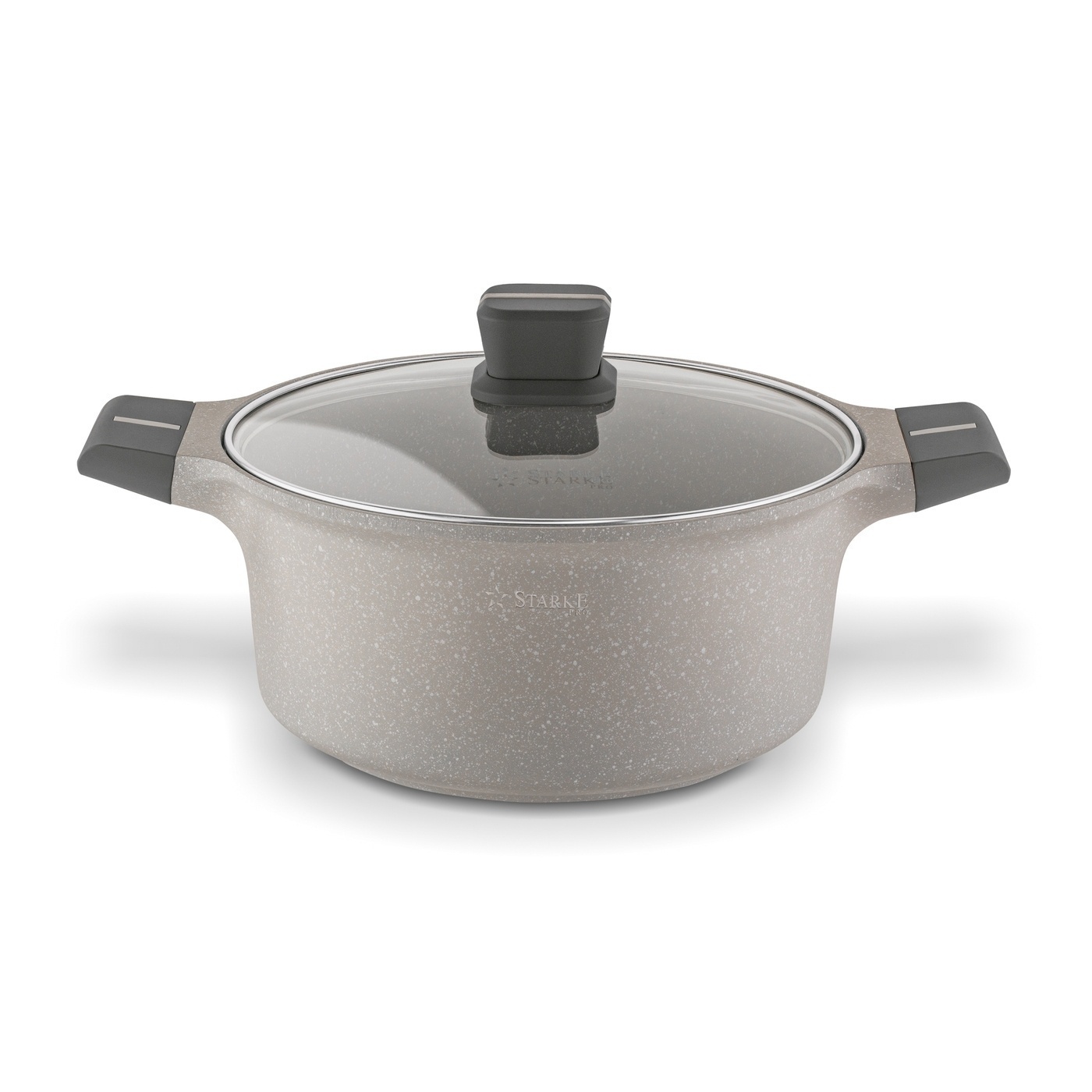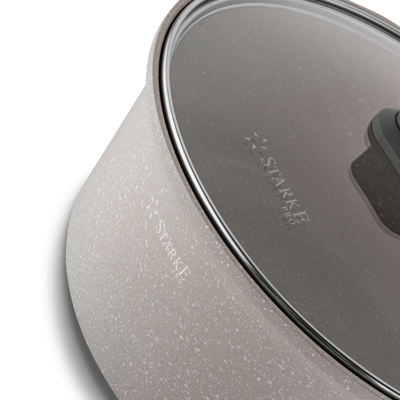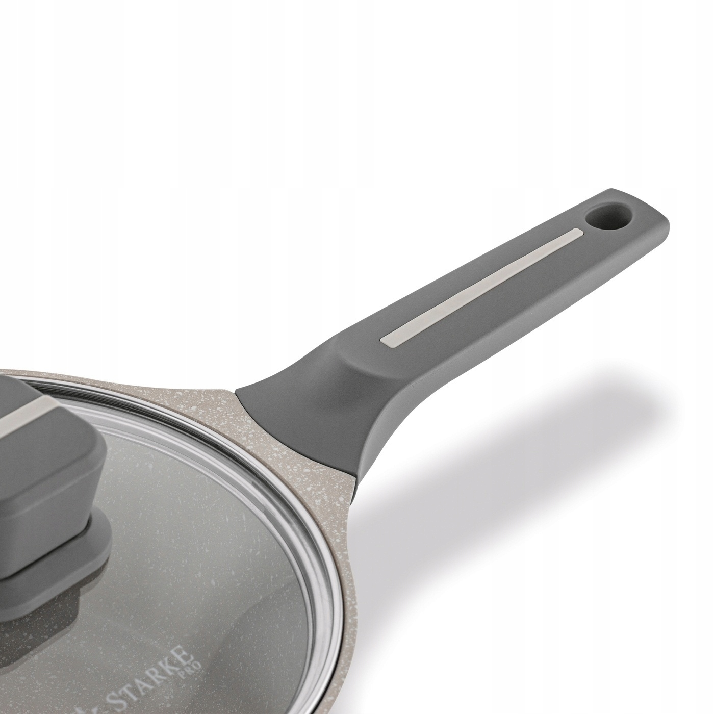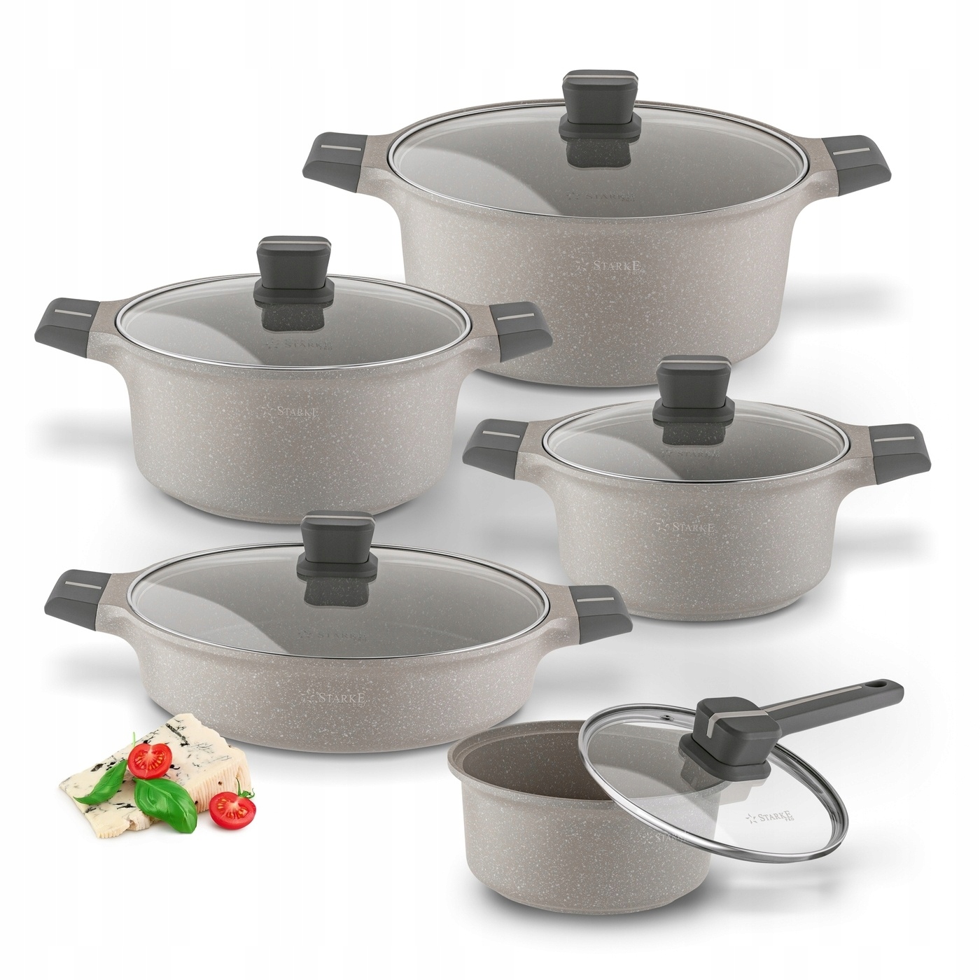 Набор посуды Starke Pro Stoneware Marble 10 легкий уход (не для посудомоечной машины, только ручная стирка). Комплект прочный и позволяет безопасное приготовление и жарка, снижая риск ожогов рук. В комплекте вы найдете посуда объемом от 1,8 до 7,5 литров. Стеклянные крышки прилагаются к кастрюле, кастрюлям и сковородкам со стальным рантом, защищающим от сколов. Они также имеют стильные ручки soft touch, которые не нагреваются и не скользят в руке. С набором кастрюль, кастрюлей и сковородой Stoneware вы можете готовить на любом типе плиты. Элегантности придает мраморное антипригарное покрытие MARBEL PLUS, который выдержит несколько циклов истирания (10 000!) и отделка алюминиевых корпусов литые и очень хорошо сбалансированные. Они быстро нагреваются, поэтому вы сэкономите время и энергию. Они отлично подойдут на семейной кухне или в качестве подарка. Они также хорошо защищены от высокой температура и равномерно проводят тепло. Они обеспечивают надежное сцепление при переноске. Об их безопасность использования и нетоксичная для окружающей среды конструкция является обозначением PFOA Free. Посол бренда и профессиональный шеф-повар Петр Кухарски рекомендует выбрать именно это комплект. По его мнению, подкрепленному личными испытаниями, он заслуживает наивысшей оценки качества ифункциональность. Набор посуды stone Stoneware Marble от бренда Starke Pro покрыт az 5-летняя гарантия!