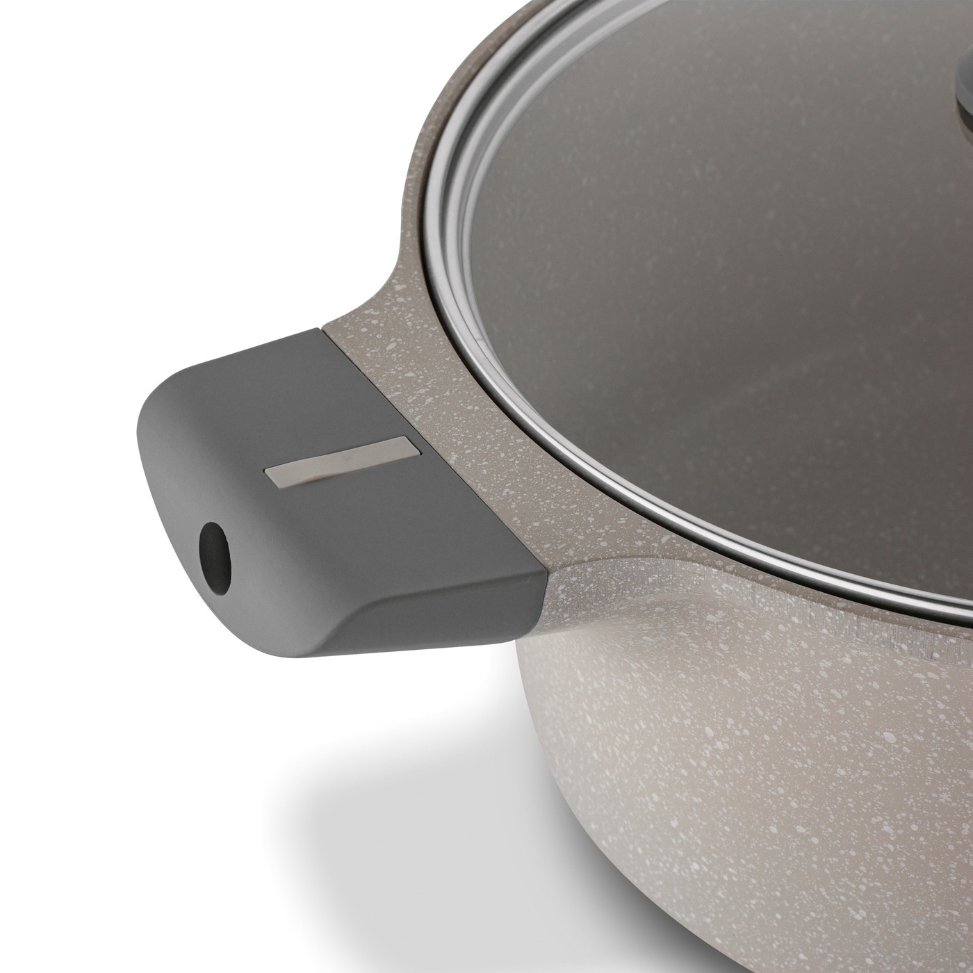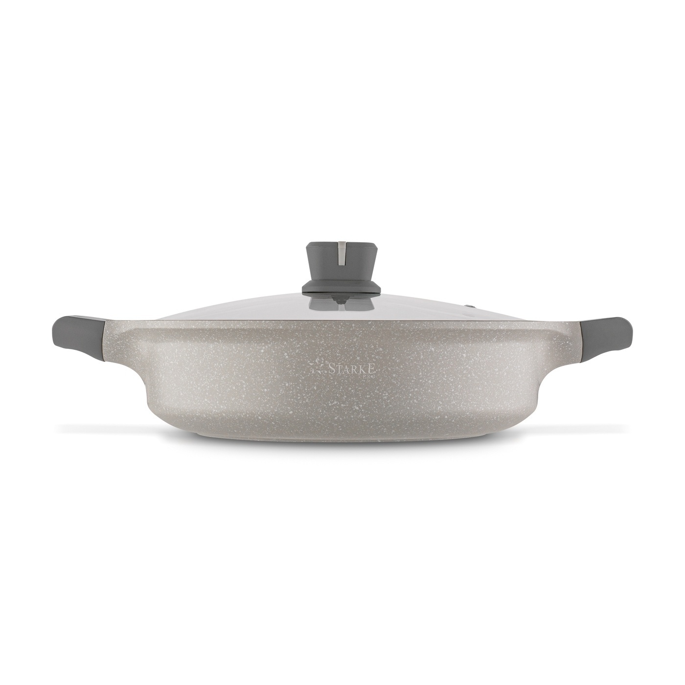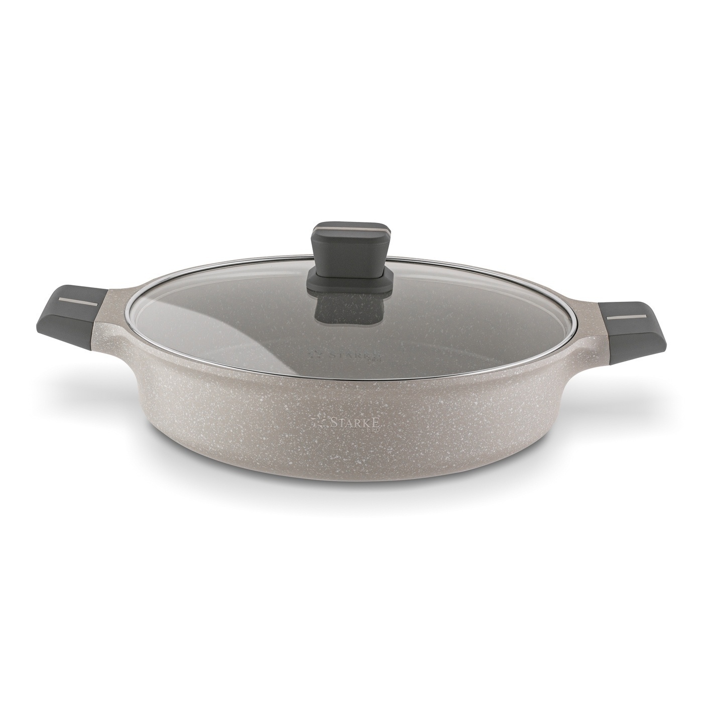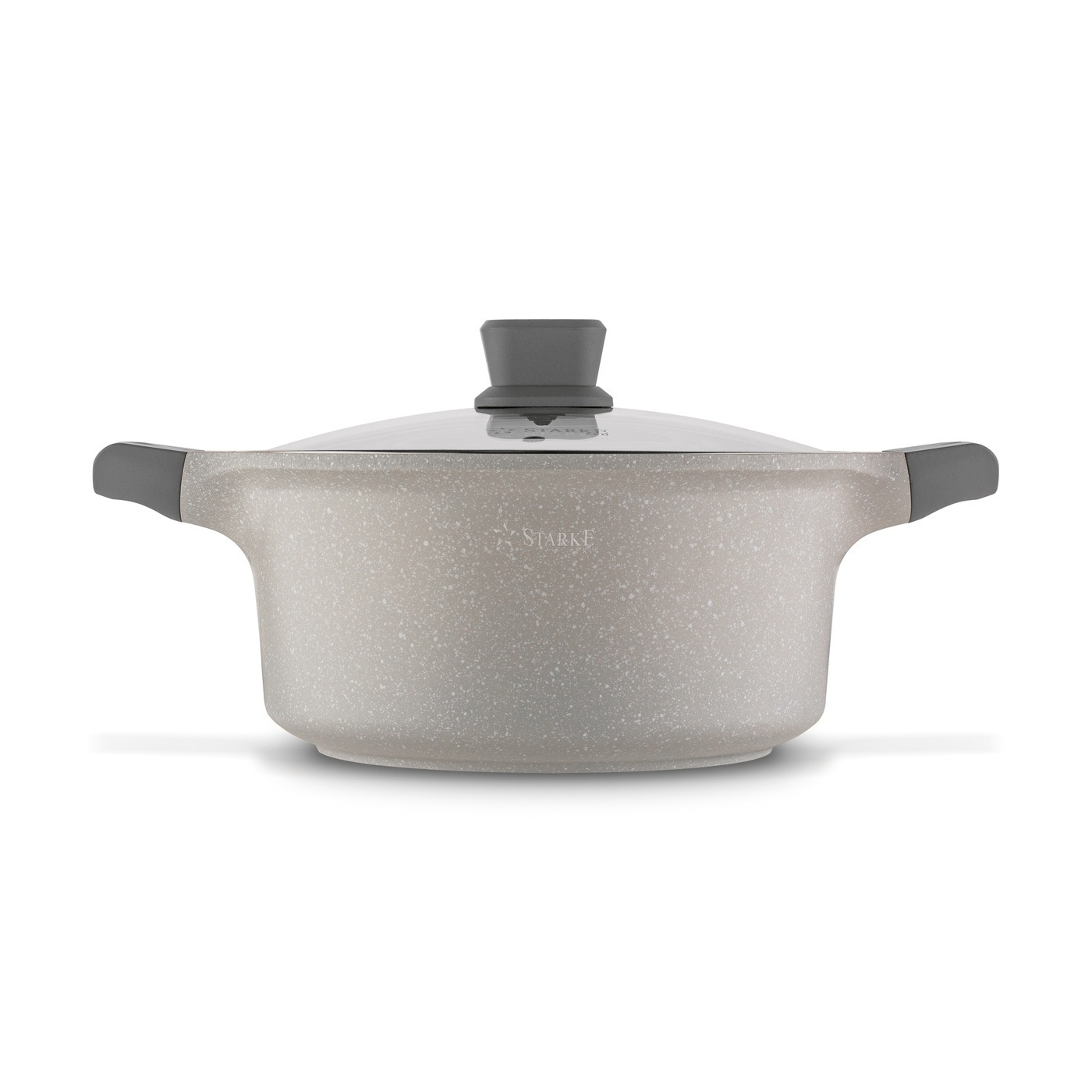 Набор посуды Starke Pro Stoneware Marble 10 легкий уход (не для посудомоечной машины, только ручная стирка). Комплект прочный и позволяет безопасное приготовление и жарка, снижая риск ожогов рук. В комплекте вы найдете посуда объемом от 1,8 до 7,5 литров. Стеклянные крышки прилагаются к кастрюле, кастрюлям и сковородкам со стальным рантом, защищающим от сколов. Они также имеют стильные ручки soft touch, которые не нагреваются и не скользят в руке. С набором кастрюль, кастрюлей и сковородой Stoneware вы можете готовить на любом типе плиты. Элегантности придает мраморное антипригарное покрытие MARBEL PLUS, который выдержит несколько циклов истирания (10 000!) и отделка алюминиевых корпусов литые и очень хорошо сбалансированные. Они быстро нагреваются, поэтому вы сэкономите время и энергию. Они отлично подойдут на семейной кухне или в качестве подарка. Они также хорошо защищены от высокой температура и равномерно проводят тепло. Они обеспечивают надежное сцепление при переноске. Об их безопасность использования и нетоксичная для окружающей среды конструкция является обозначением PFOA Free. Посол бренда и профессиональный шеф-повар Петр Кухарски рекомендует выбрать именно это комплект. По его мнению, подкрепленному личными испытаниями, он заслуживает наивысшей оценки качества ифункциональность. Набор посуды stone Stoneware Marble от бренда Starke Pro покрыт az 5-летняя гарантия!