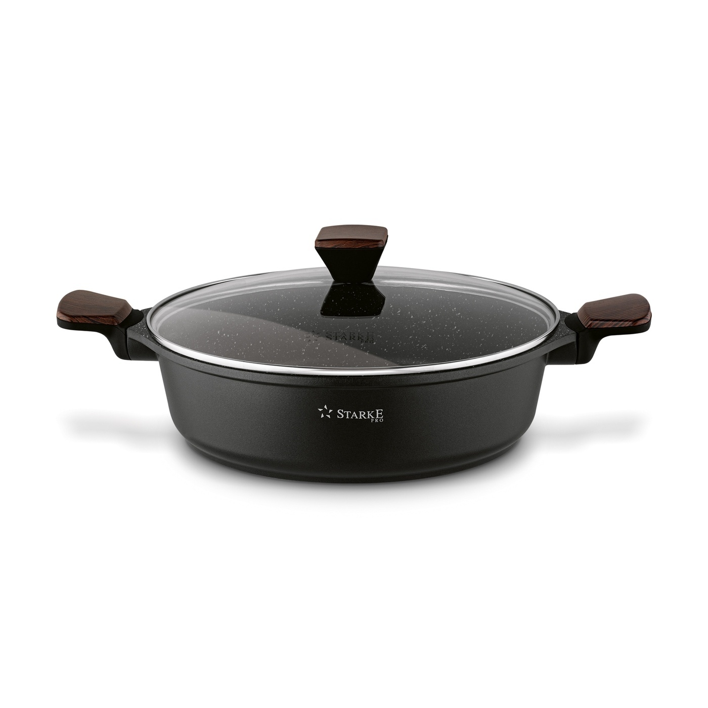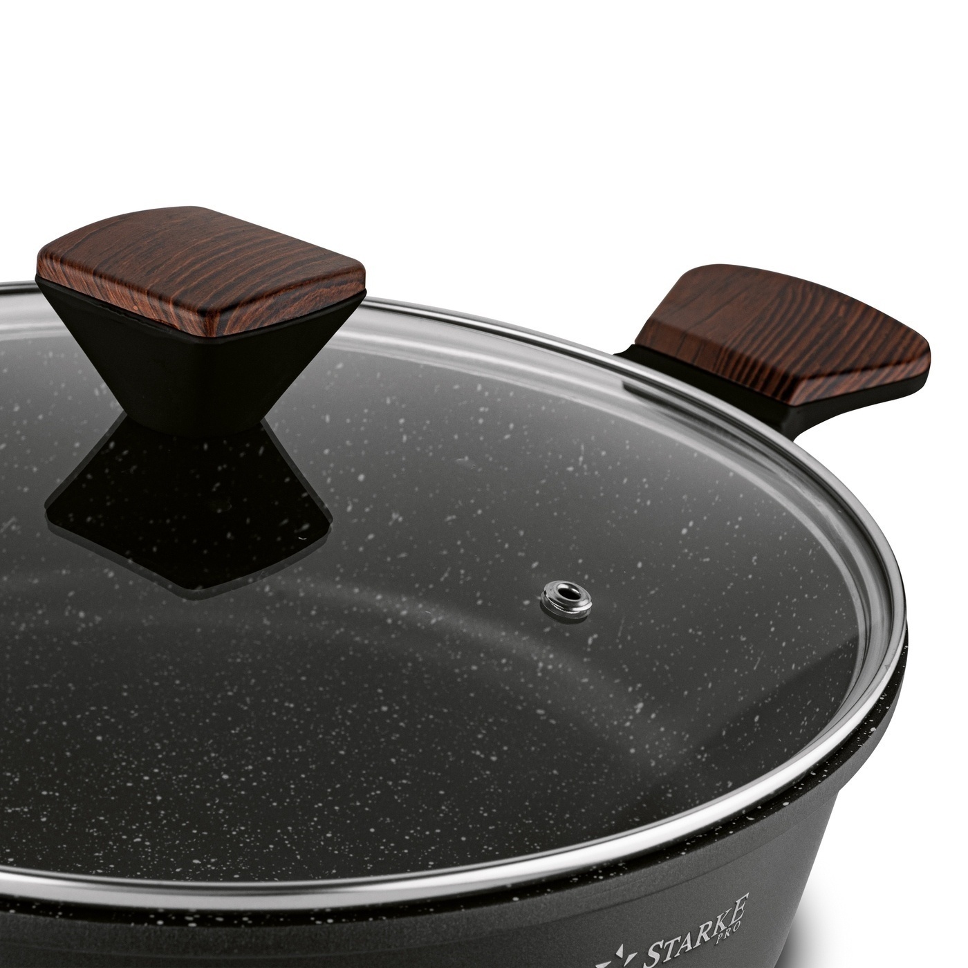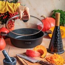 Pozostałe informacje: - korpus odlewany, wykonany z aluminium, pokryty powłoką Marble Plus posiadającą naturalną chropowatą teksturę o wysokiej przyczepności i doskonałej odporności na ścieranie i zarysowania, - powłoka trzywarstwowa, - 10 000 cykli ścierania, - grubość dna: 3,2 mm, - grubość ścianki: 2,8 mm, - grubość brzegu: 4 mm, - antypoślizgowe uchwyty soft touch, - PFOA free, - pokrywa szklana ze stalowym rantem i odpowietrznikiem