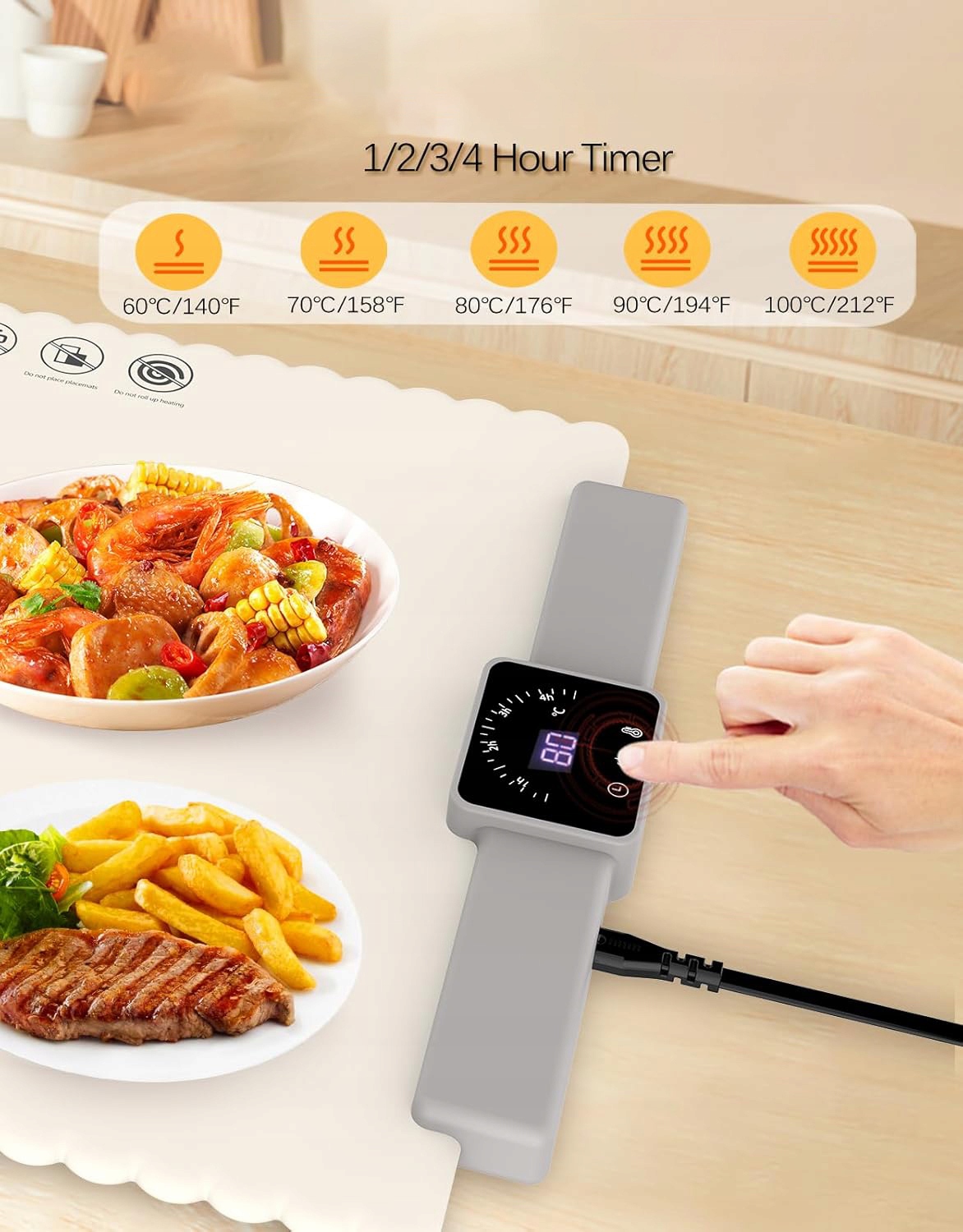 Nasza silikonowa mata grzewcza do żywności jest dostępna w 5 trybach (60℃/140℉, 70°C/158°F, 80°C/176°F, 90℃/194°F, 100°C/212°F) i może utrzymać ciepło jedzenia do 4 godzin.