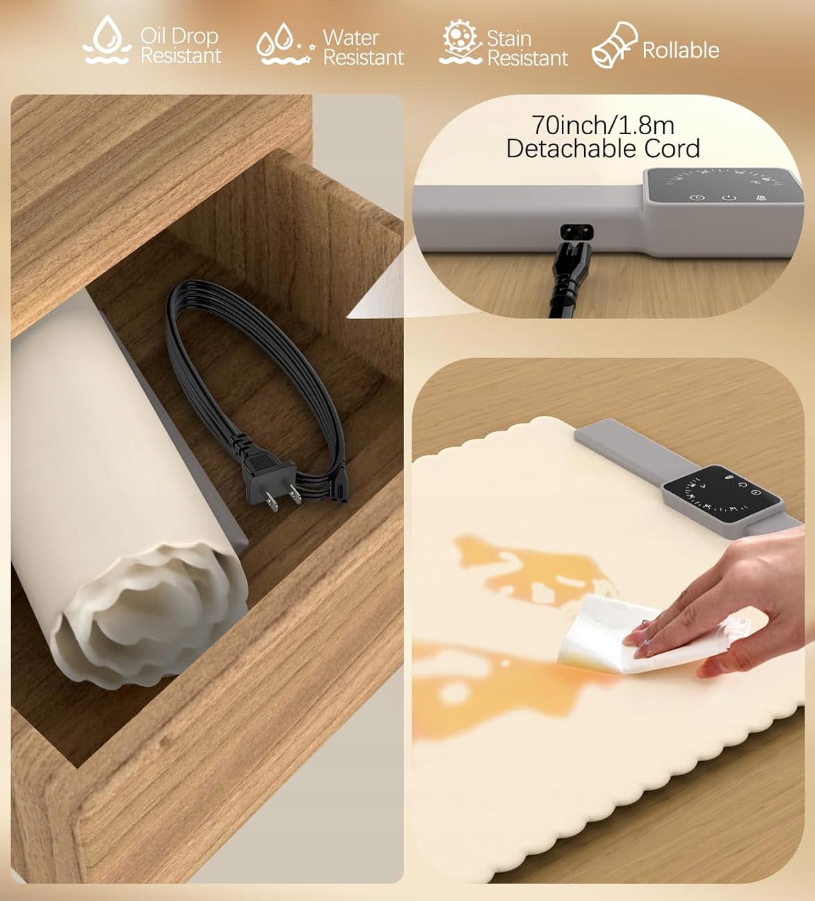 Wykonana z najwyższej jakości elastycznego materiału silikonowego nano, nasza elektryczna tacka grzewcza jest trwała, odporna na zachlapanie, plamy i olej.
