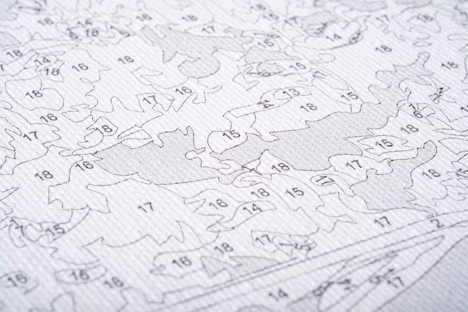 ➡️ Zagruntowane płótno na blejtramie: Wykonane ze 100% bawełny, starannie naciągnięte na solidne, sosnowe krosno malarskie. Płótno jest już wstępnie podzielone na numeryczne pola, które precyzyjnie wyznaczają miejsca do malowania.
