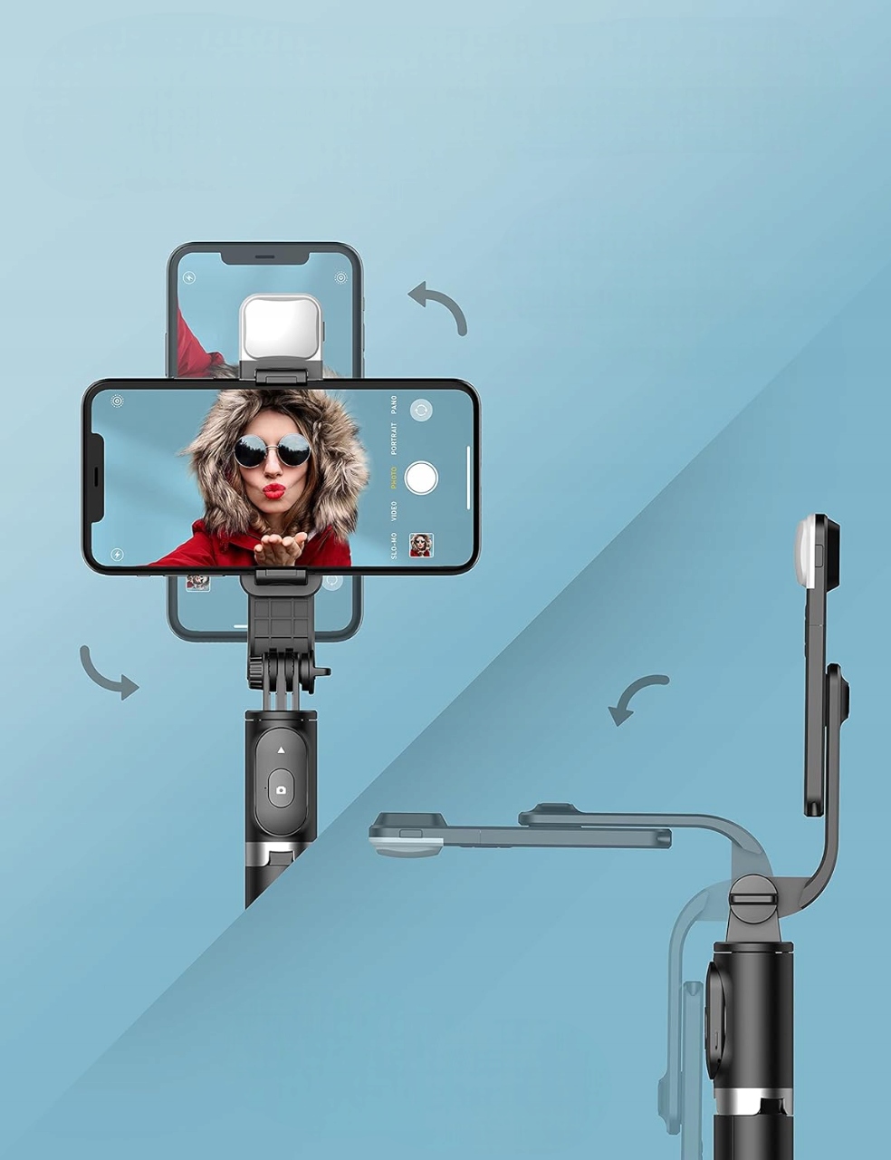Ruchoma głowica z możliwością obrotu o 180° umożliwia precyzyjne ustawienie smartfona zarówno w orientacji pionowej, jak i poziomej. Dodatkowo, uchwyt z pełnym obrotem o 360° gwarantuje pewne i stabilne zamocowanie telefonu, zapewniając możliwość wykonywania zdjęć pod dowolnym kątem. Ergonomiczna konstrukcja sprawia, że kijek wygodnie leży w dłoni, zwiększając komfort użytkowania.