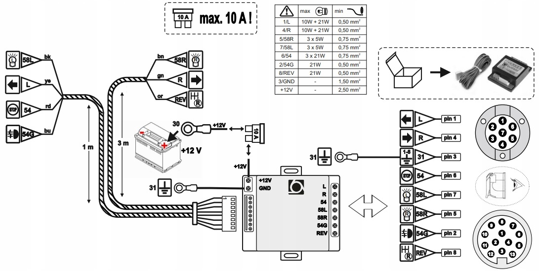 Moduł został zaprojektowany do podłączenia 8-przewodowej instalacji przyczepy (czyli ze światłem wstecznym) i powinien być użyty z gniazdem 13-pinowym ale może być użyty z gniazdem 7-pinowym (wówczas bez obsługi światła wstecznego).