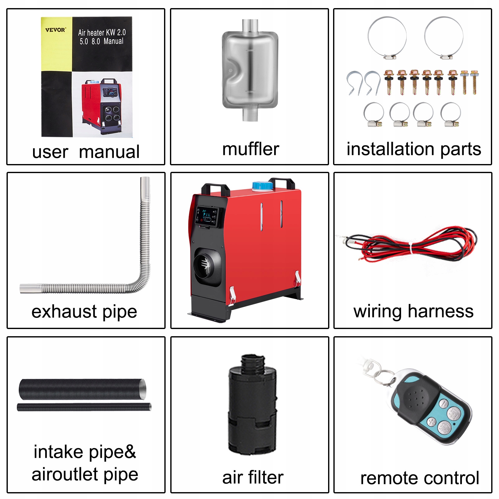 Łatwa instalacja: zbiornik paliwa, nagrzewnica i pompa paliwowa nagrzewnicy postojowej na oleju tworzą całość, co sprawia, że instalacja jest bardzo łatwa. Z akcesoriami: 1 x podgrzewacz diesla all-in-one, 1 x pilot zdalnego sterowania, 1 x tłumik, 1 x wiązka przewodowa, 1 x filtr powietrza, 1 x rura wlotowa i wyciągowa, 1 x rura wyciągowa, 1 x zestaw montażowy . Kompletny zestaw ułatwiający montaż ogrzewania postojowego w pojeździe. Można go elastycznie włączyć w przypadku kontenera, bagażnika lub pod kontenerem.