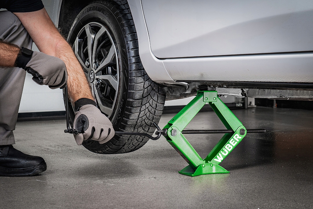 ✔️ Widoczne w gumie wgłębienie umożliwia zaczepienie podnośnika o przeznaczone do tego miejsce w podwoziu samochodu