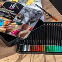 Kredki zostały zapakowane w praktyczne plastikowe tacki z przegrodami, a całość jest ulokowana w ładnym metalowym etui, które zabezpieczy zawartość przed uszkodzeniem.