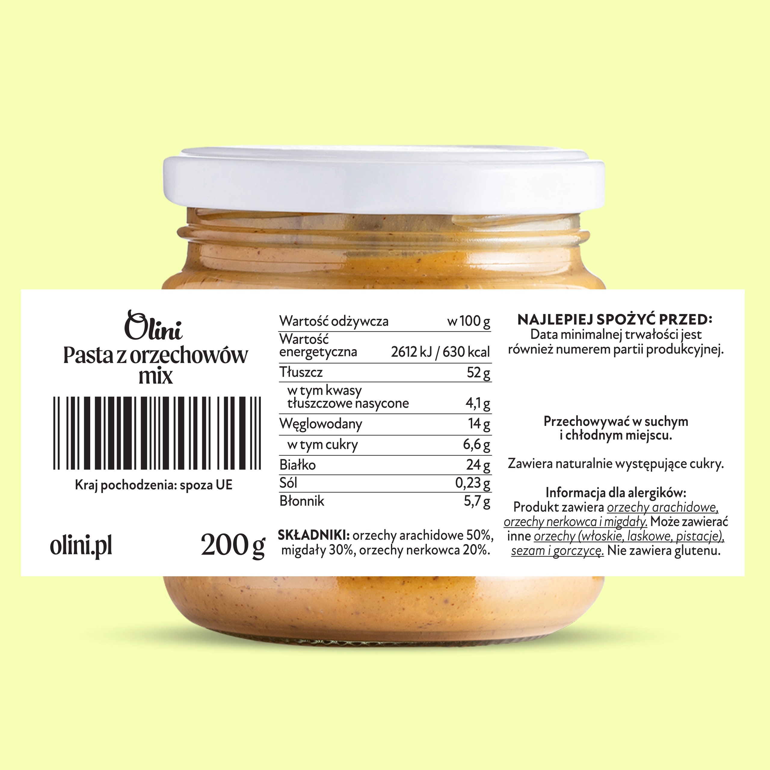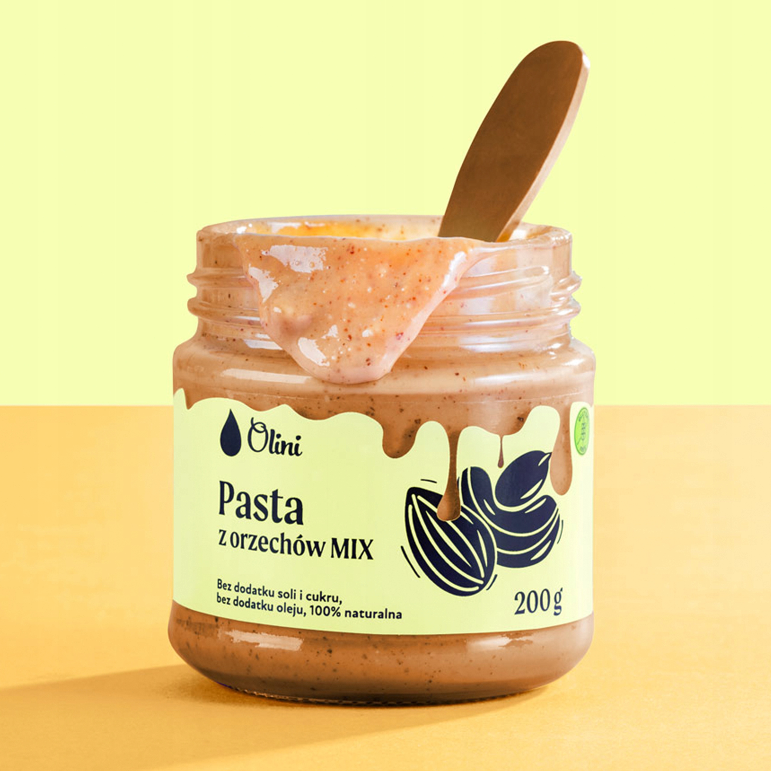 Krem orzechowy (mix) Olini jest mieszanką, której nie sposób się oprzeć! Ma prosty skład – to 100% orzechów. Tworzą go arachidy, migdały i pistacje. Nie znajdziesz w niej zbędnych dodatków, takich jak słodziki, sól czy olej palmowy. Nic dziwnego, że tak szybko znika ze słoiczka!