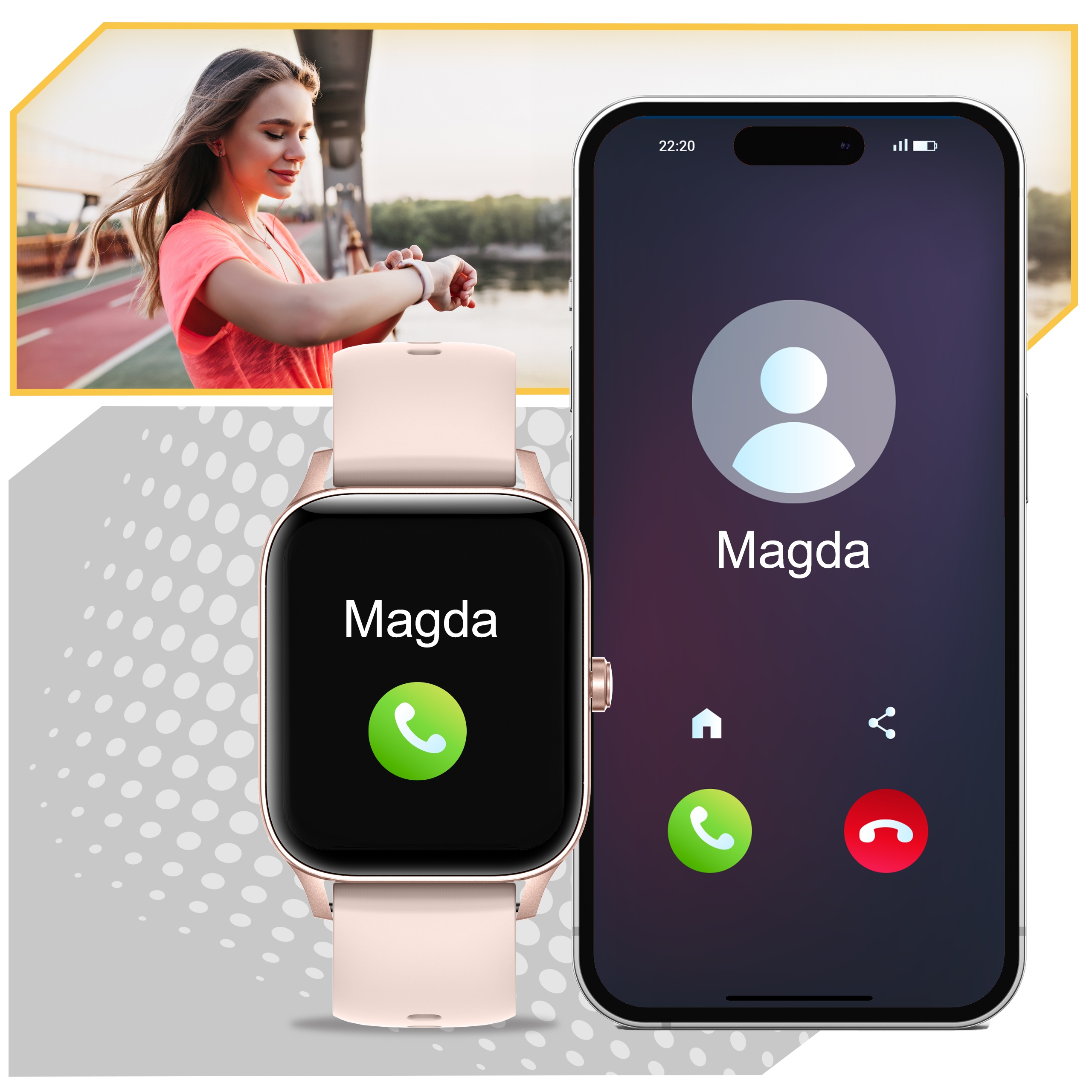 Nasz smartwatch łączy się z telefonem poprzez Bluetooth. Co więcej – posiada wbudowany głośnik oraz mikrofon, dzięki czemu pozwala na komfortowe obsługiwanie połączeń!