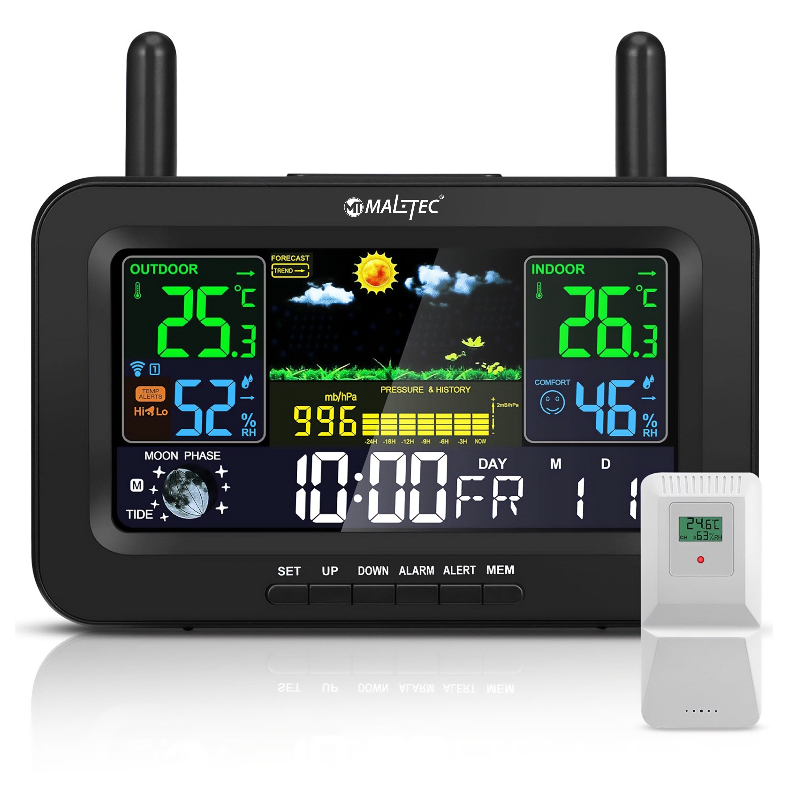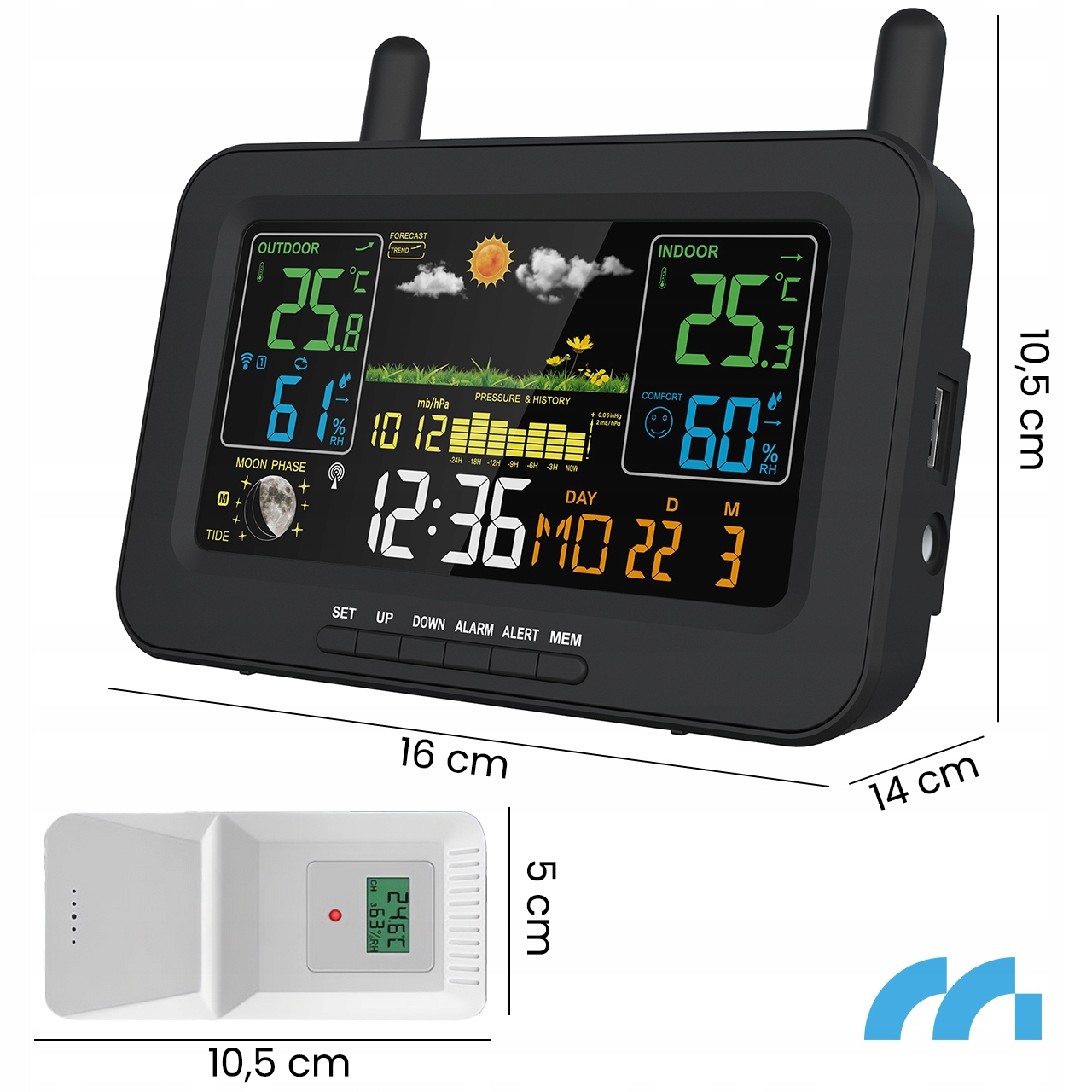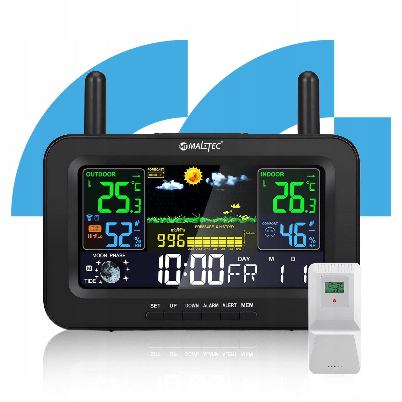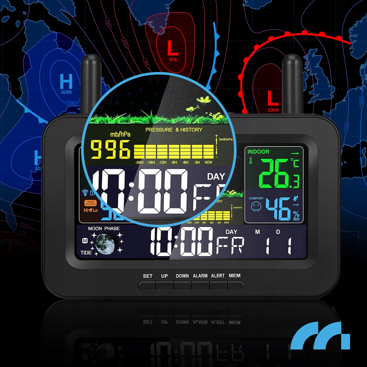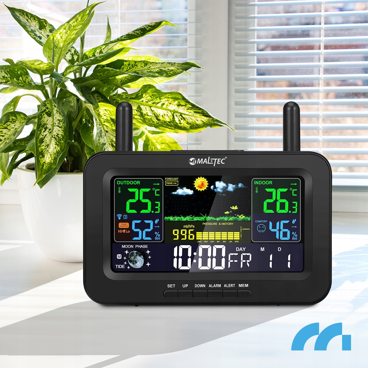 Stacja Daily1000M pozwala na precyzyjny pomiar kluczowych parametrów pogodowych zarówno wewnątrz, jak i na zewnątrz Twojego domu. Oprócz temperatury i wilgotności, urządzenie rejestruje również ciśnienie atmosferyczne, dzięki czemu masz pełny obraz pogody.