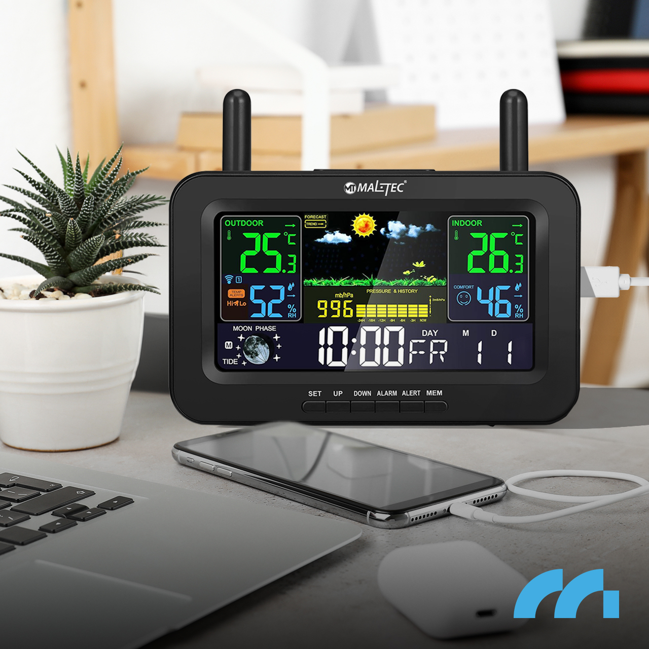 Stacja pogodowa Daily1000M to wszechstronne urządzenie wyposażone w prognozę pogody, fazy księżyca, wskaźnik komfortu w pomieszczeniu, a także alarm punktu zamarzania. Liczne dodatkowe funkcje czynią ją idealnym narzędziem do kontrolowania warunków atmosferycznych.