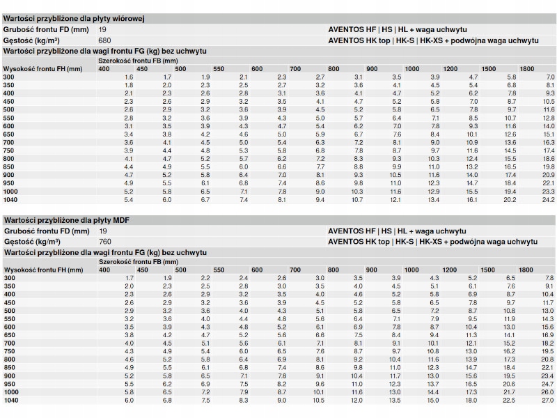 W celu obliczenia potrzebnej mocy siłowników należy skorzystać z wzoru: LF=Wysokość korpusu (mm) x waga frontu łącznie z podwójną wagą uchwytu (kg). Wagę frontu odczytujemy z tabelki poniżej w zależności od rodzaju płyty. Otrzymany wynik należy porównać ze skalą mocy LF. W przypadku spornych, granicznych danych zalecamy silniejszy siłownik.