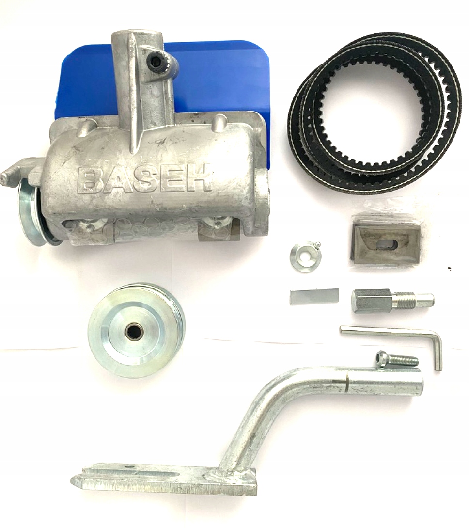 Komplet zawiera głowicę korowarki z czterema nożami, co pozwala na korowanie na całej szerokości głowicy. Dodatkowo, w komplecie znajduje się pasek klinowy, 2 noże zapasowe, tuleja adaptera, zamek cylindryczny oraz różne dodatkowe części i wspornik. Należy pamiętać, że korowarka nie zawiera pilarki.
