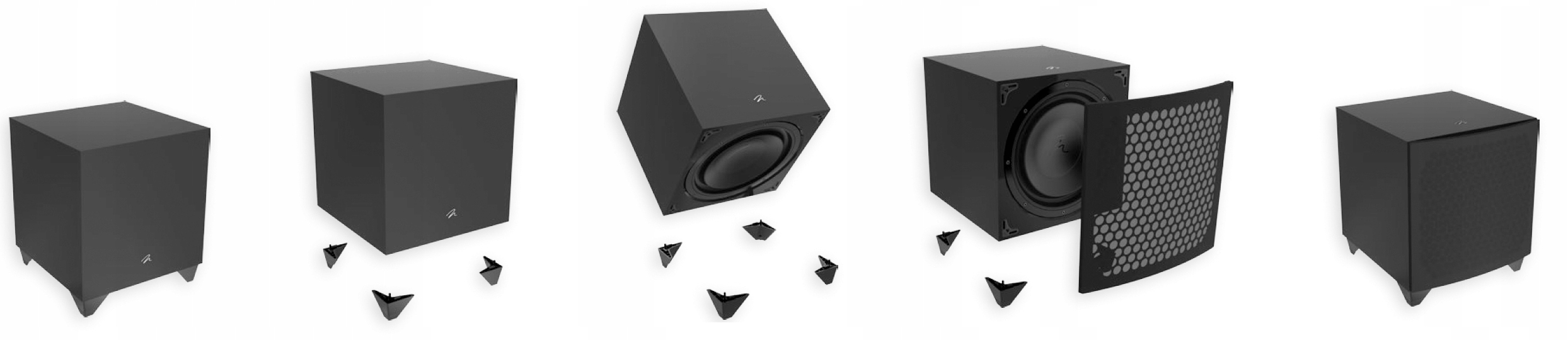Po umieszczeniu w obudowie lub w innym dyskretnym miejscu, subwoofery Dynamo 800X, 1100X i 1600X można z łatwością przekształcić z trybu standardowego do orientacji przedniej. Maskownica jest kompatybilna w przypadku ustawienia subwoofera w orientacji frontowej.
