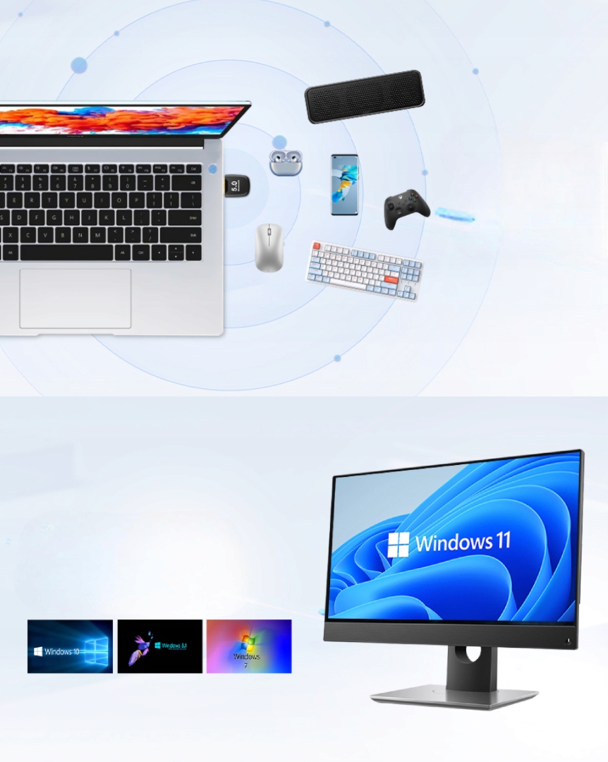 Ulepszony klucz sprzętowy Bluetooth 5.4 firmy Sounix ma szeroki zakres zastosowań. Można jednocześnie podłączyć do 5 urządzeń poprzez bezprzewodową technologię Bluetooth. Takie jak głośniki Bluetooth, klawiatury, zestawy słuchawkowe, myszy i drukarki Bluetooth itp.