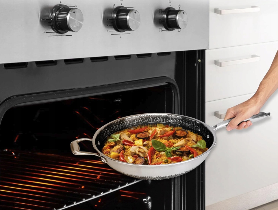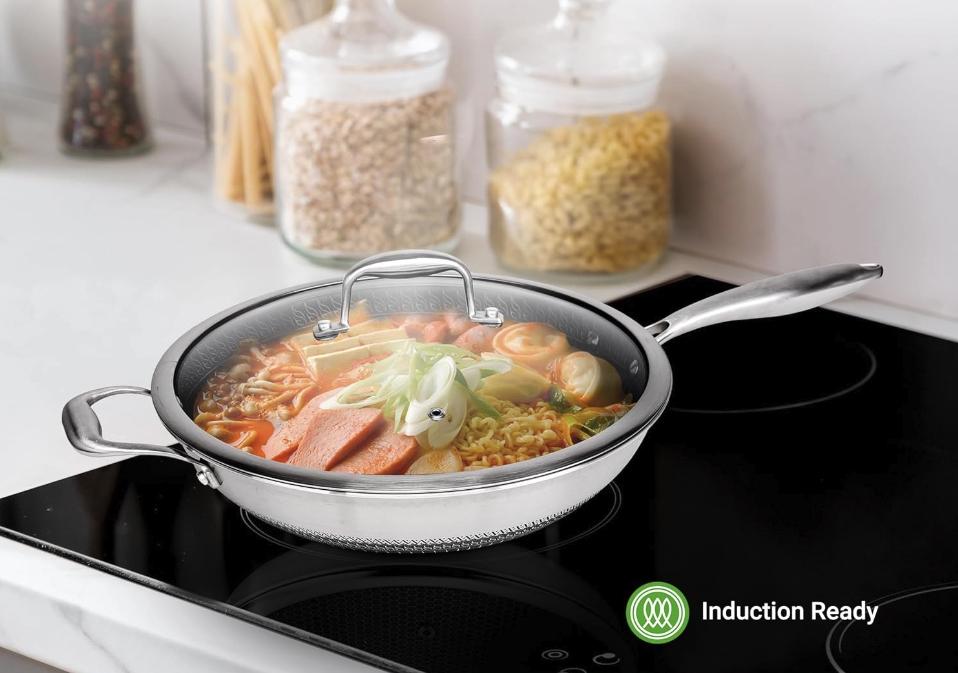 ➡️ RÓWNOMIERNE GOTOWANIE: Wok z stali nierdzewnej Nutrichef wykonany jest z trójwarstwowej struktury, gdzie rdzeń aluminiowy jest umieszczony między dwoma warstwami stali nierdzewnej, co zapewnia szybkie i równomierne rozprowadzanie ciepła. Bezpieczny do użytku w piekarniku do 260°C.