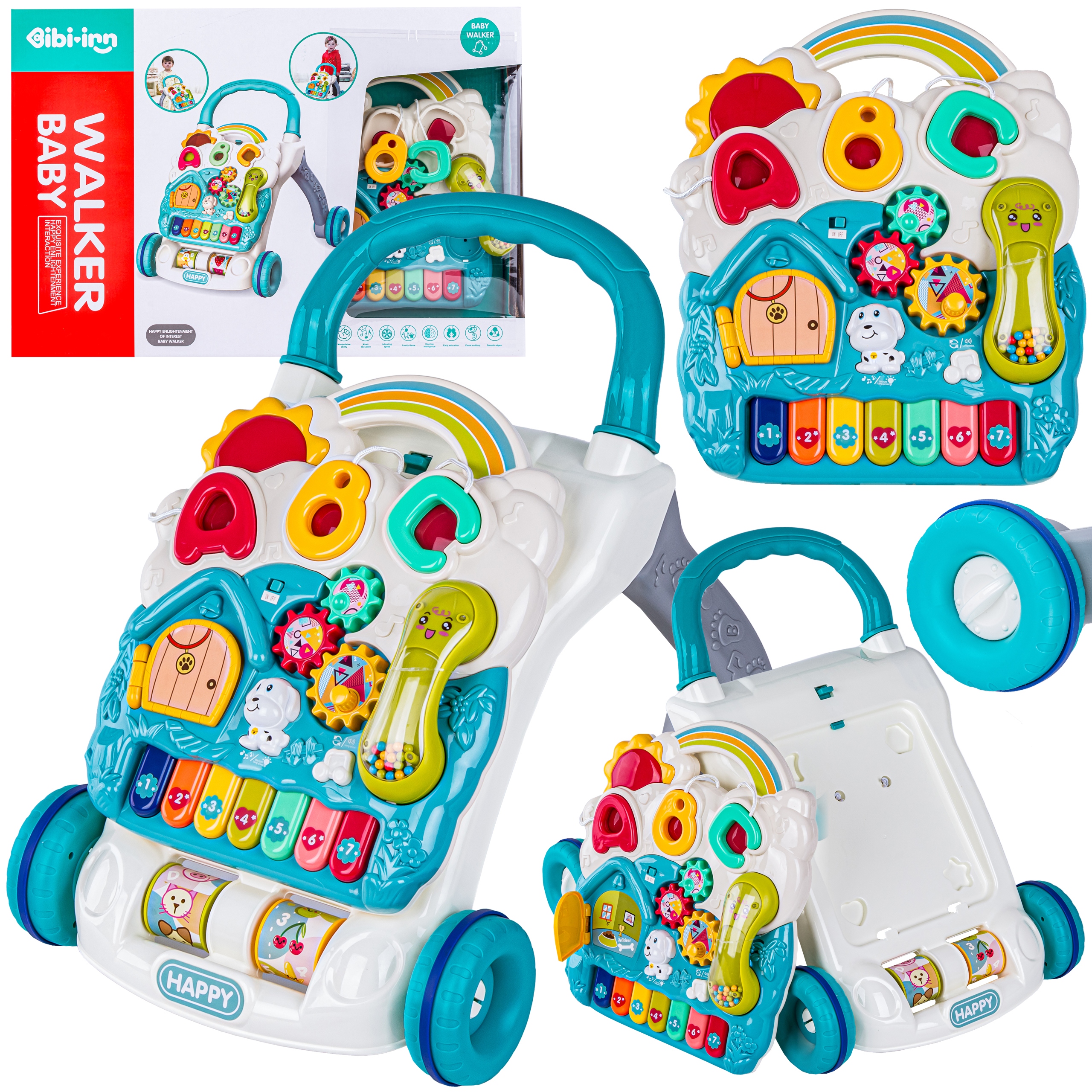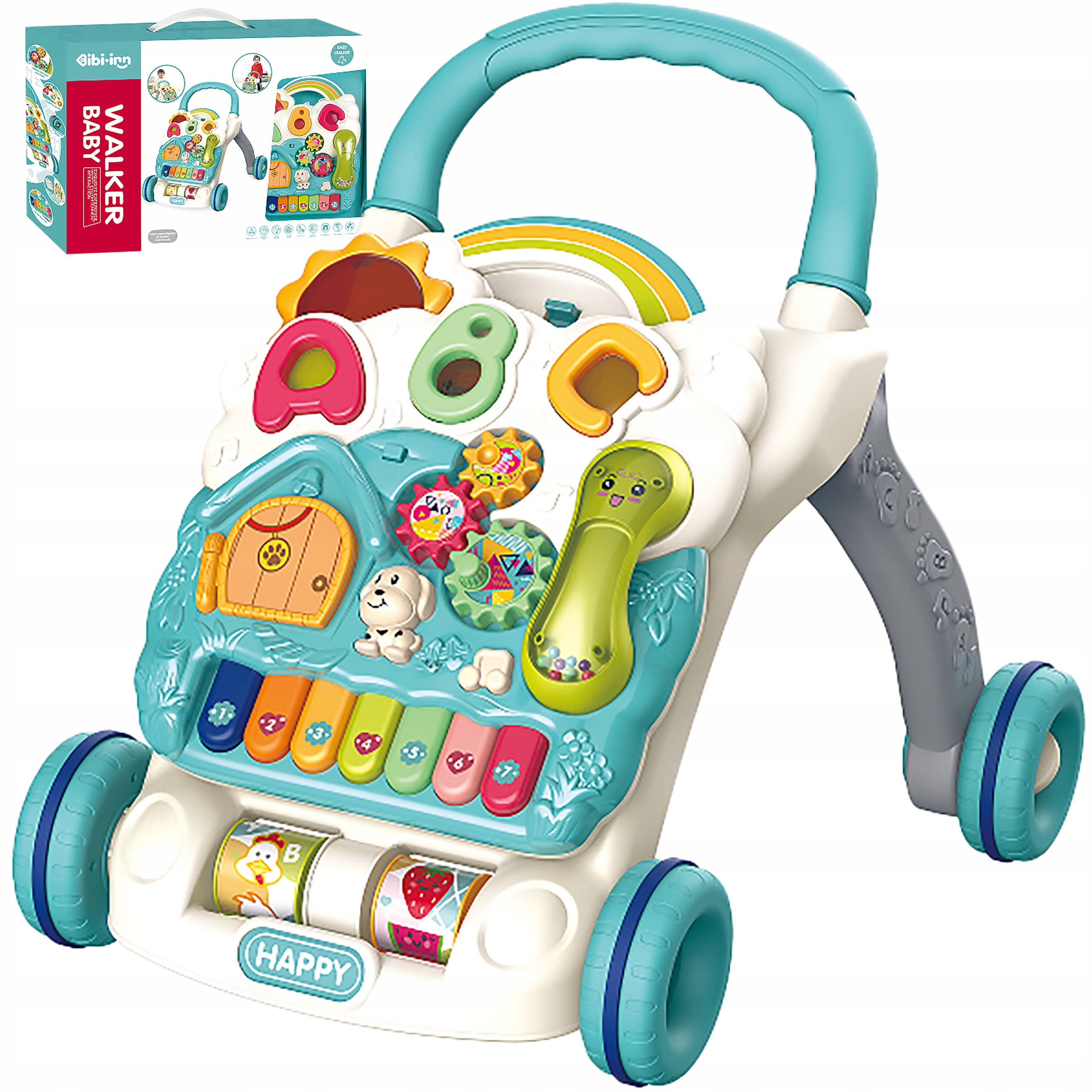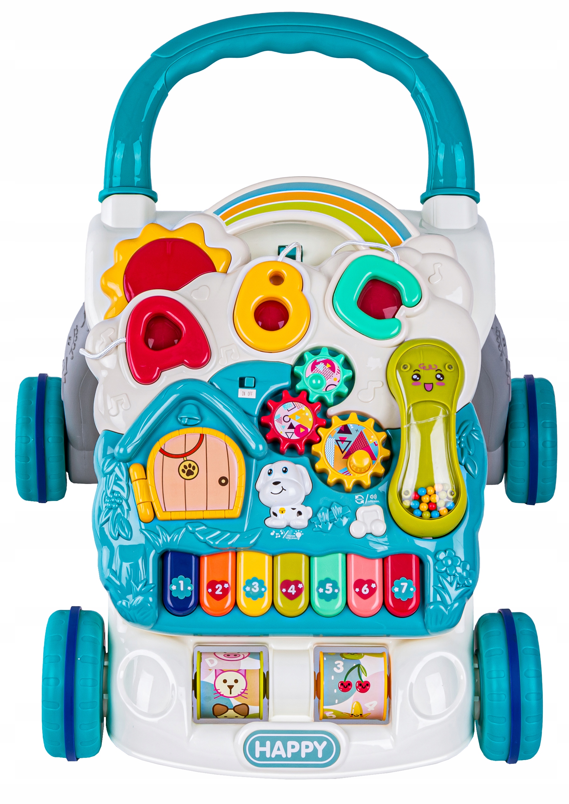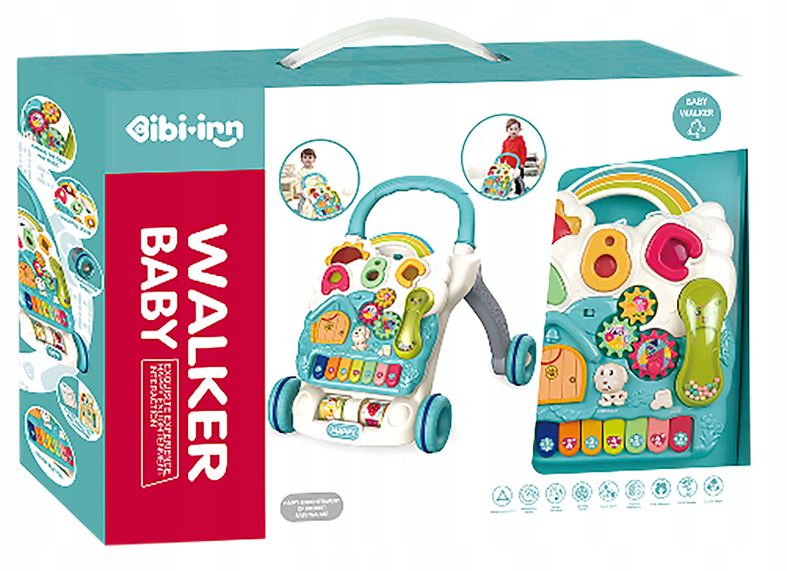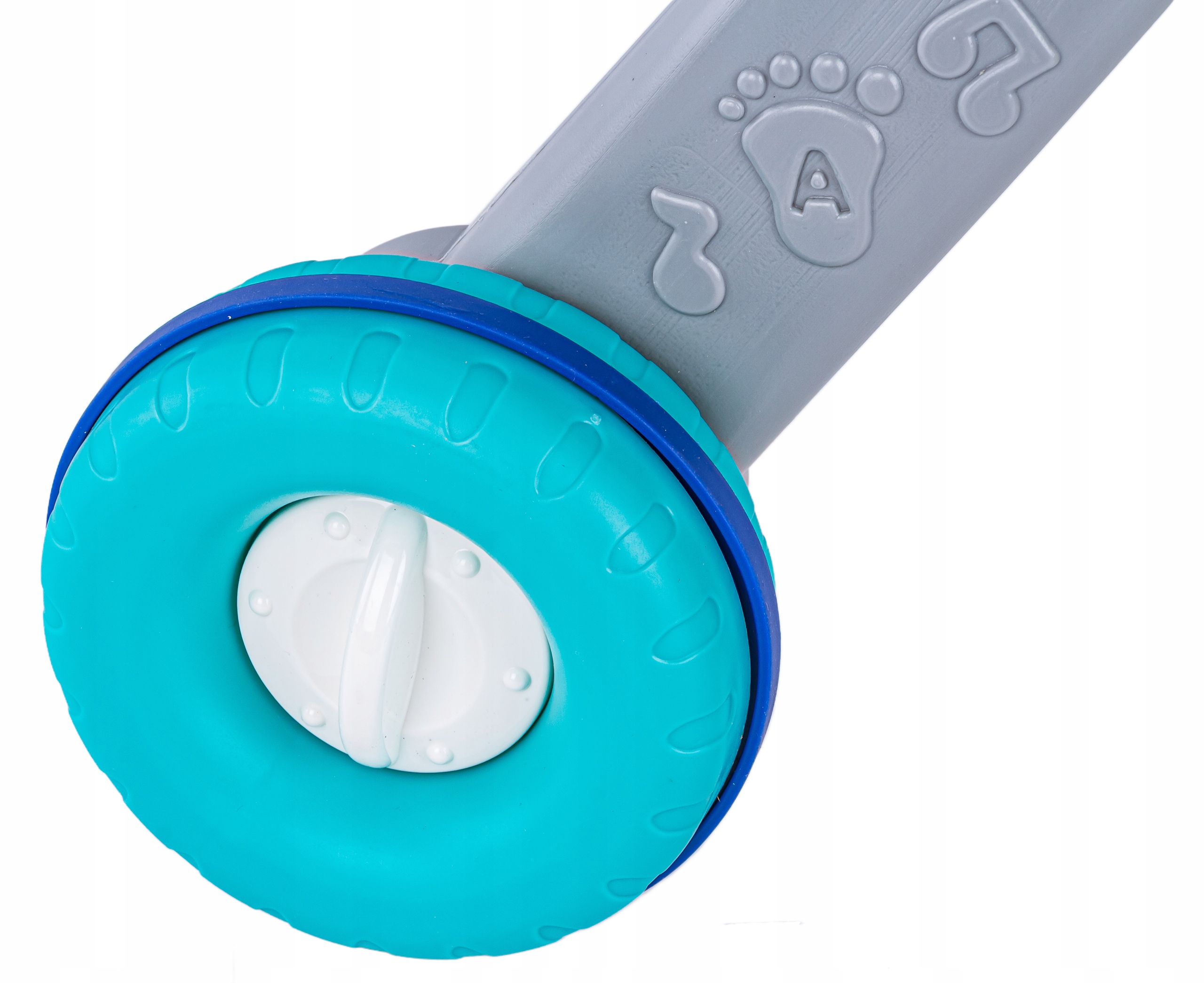 Chodzik w głównym stelażu posiada dwie obrotowe rolki z kolorowymi obrazkami (zwierzęta, owoce, cyferki i literki). Duże gumowane kółka gwarantują większą stabilność oraz cichszą jazdę.