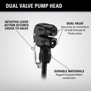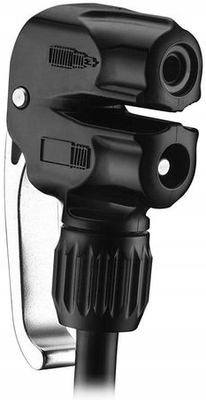 Końcówka pompki Dual Valve o konstrukcji slip fit jest kompatybilna z wentylami Presta, Dunlop oraz Schrader. Wykonana z trwałego materiału Composite Matrix, zapewnia długowieczność i niezawodność. Wyposażona w ergonomiczną aluminiową dźwignię blokującą, która umożliwia łatwe i pewne mocowanie do zaworu.