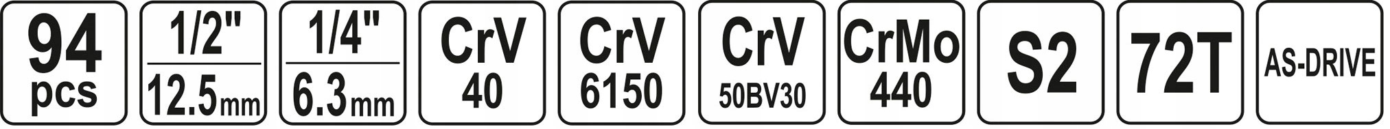 Klucze nasadowe, jak i napęd nasadek, zostały wykonane z wytrzymałej, narzędziowej stali chromowo-wanadowej CrV 50BV3. Nasadki wykonano metodą kucia matrycowego, a przed procesem hartowania poddano je kalibracji za pomocą precyzyjnych przymiarów i urządzeń kontrolnych.