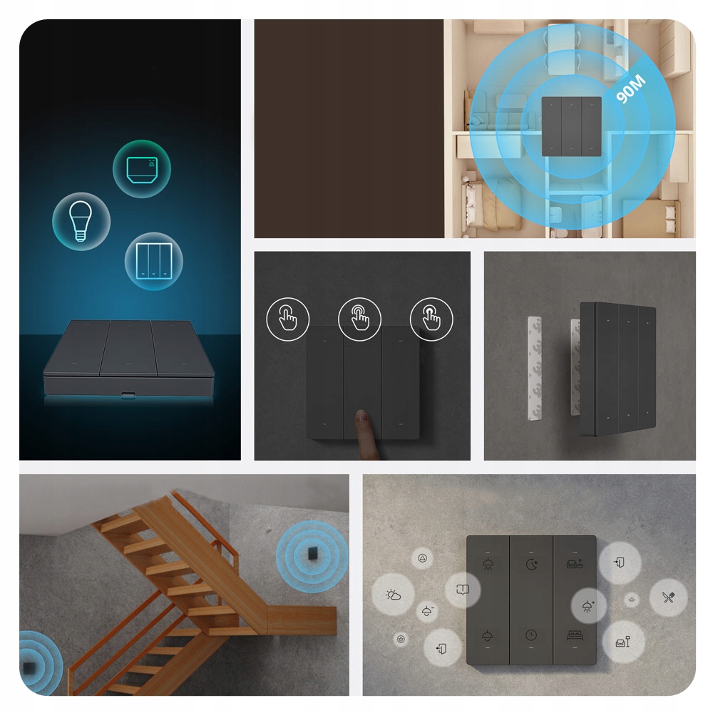 Urządzenie jest niezwykle proste w montażu. Wystarczy przykleić je do ściany za pomocą naklejek samoprzylepnych, które znajdziesz w opakowaniu. Nie musisz przejmować się okablowaniem! Możesz też korzystać z przełącznika jak ze zwykłego pilota i po prostu położyć go na stole lub półce. Co więcej, do zasilania urządzenia wystarczą 2 baterie CR2032, które zapewnią czas pracy sięgający 2 lat.