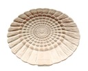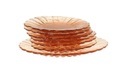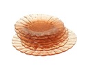 Talerze deserowe (1 duży i 6 małych) wykonane z różowego szkła prasowanego. Projekt Eryki Trzewik-Drost dla Huty Szkła Gospodarczego „Ząbkowice” w Dąbrowie Górniczej. Seria „Cora”. Lata 70XXw.