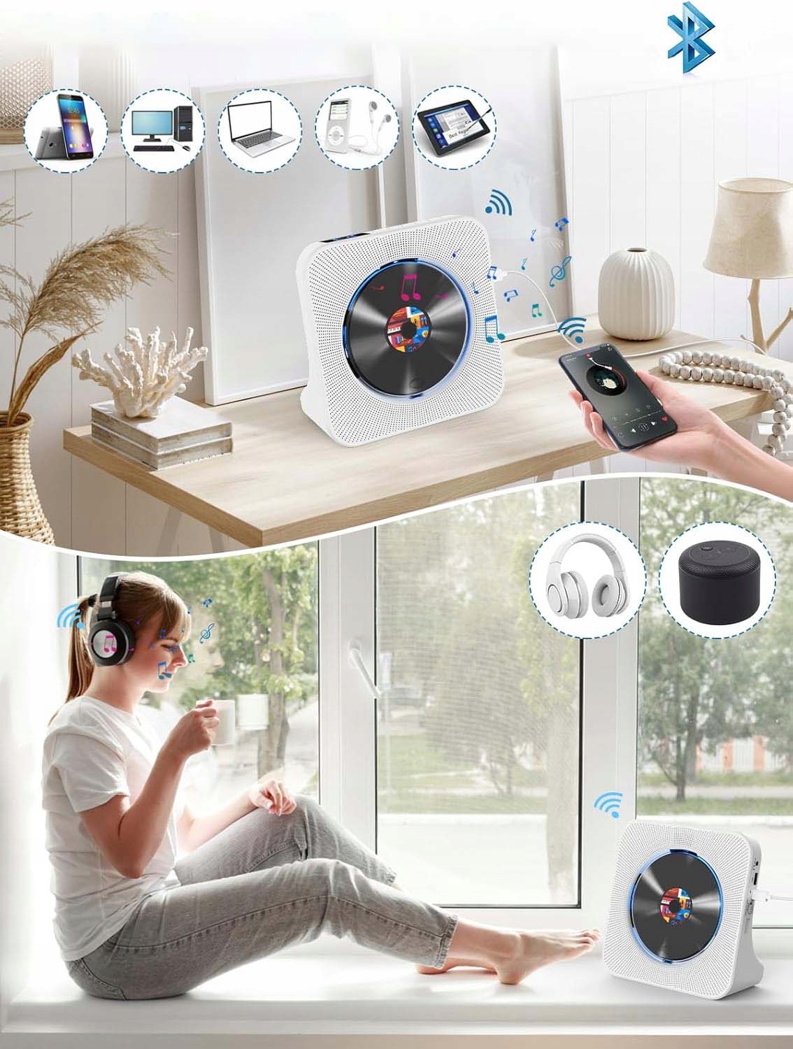 odtwarzacz CD na biurko można podłączyć do innych urządzeń z obsługą Bluetooth (telefon komórkowy/tablet/laptop/airpods). Wbudowane głośniki stereo HI-FI projektują i regulują głośność w razie potrzeby.