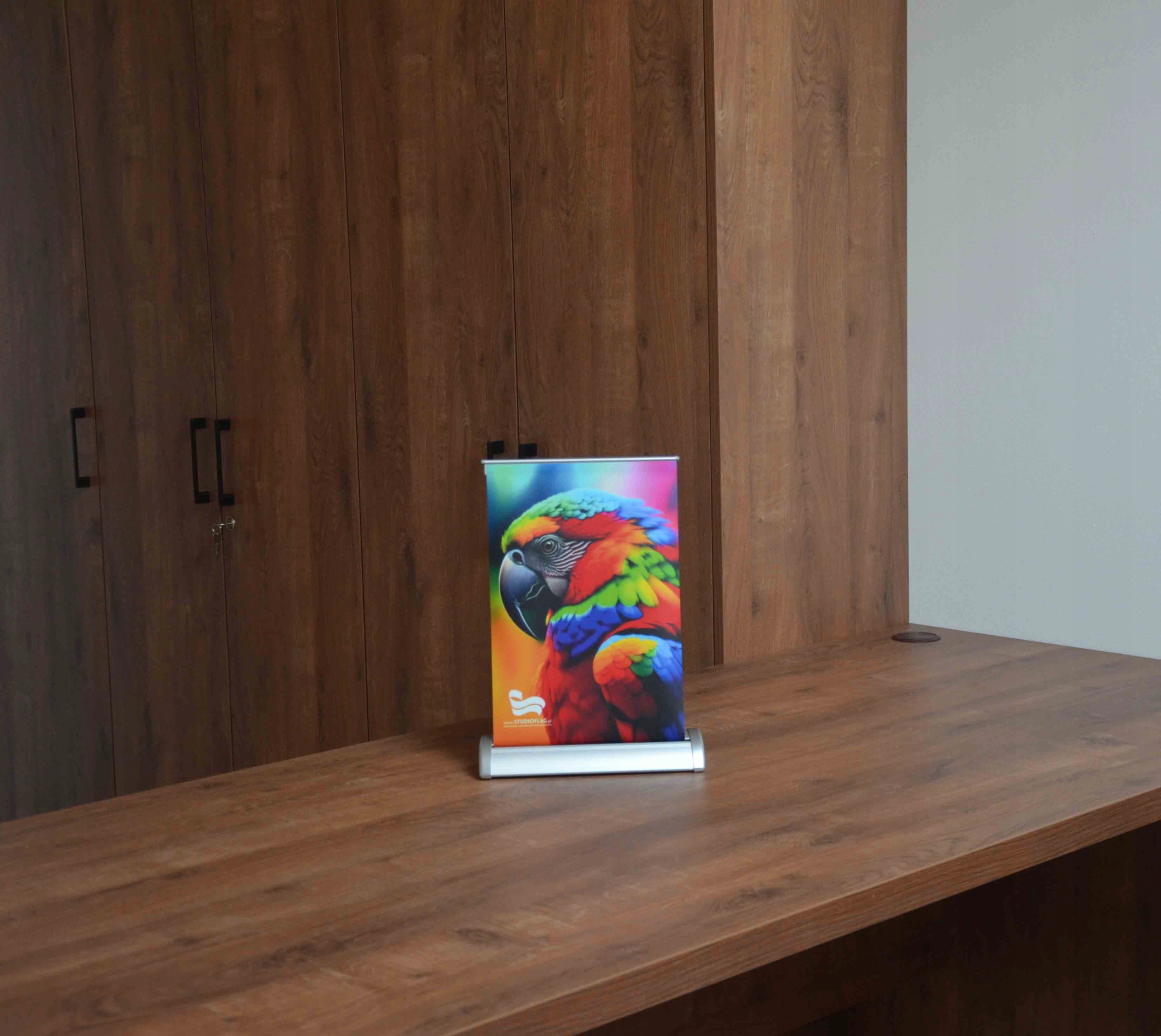 Mini Roll-up to jednostronny, kompaktowy ekspozytor reklamowy, idealny do użytku na biurkach, ladach czy stołach podczas targów i innych wydarzeń promocyjnych.