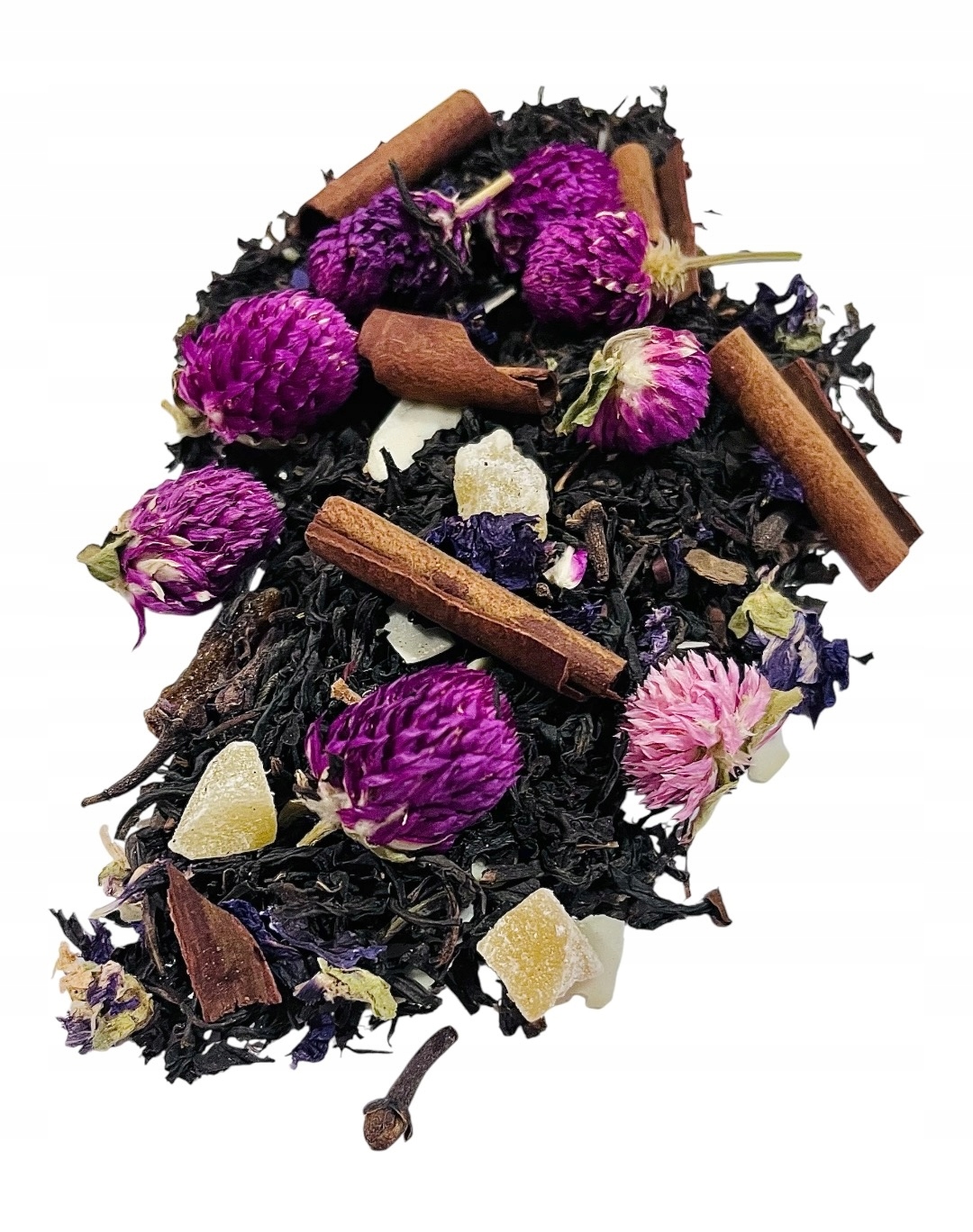 SKŁAD: Herbata czarna Yunnan, winogrono, cynamon, płatki migdałowe, imbir kandyzowany, płatki róży, gomfrena, aromat.