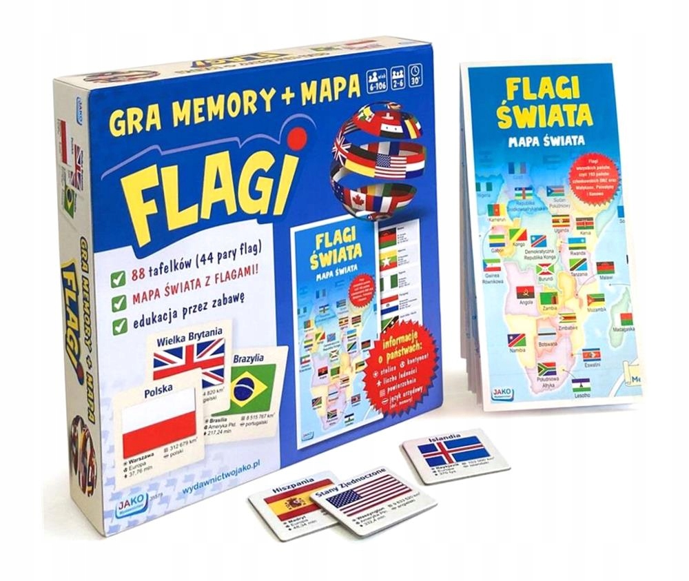 Memory to świetna zabawa dla dzieci i dorosłych, dzięki której można nie tylko miło spędzić czas, ale również trenować pamięć, koncentrację i spostrzegawczość. Instrukcja. Gra polega na odkrywaniu tafelków i znajdowaniu par. Wymieszane kartoniki należy ułożyć w kilku rzędach, flagi mają być zakryte. Grę rozpoczyna najmłodszy gracz, a następnie kolejka przebiega zgodnie z kierunkiem ruchu wskazówek zegara. Gracz odkrywa dwa z nich - jeśli są takie same, zabiera je do siebie jako zdobytą parę i może odkrywać ponownie. Jeśli są różne, odkłada je na miejsce. Następnie ruch należy do kolejnego gracza. Gra kończy się, gdy nie ma już żadnych tafelków. Wygrywa osoba, która zdobędzie najwięcej par. Gra może zakończyć się remisem. Flagi świata. Mapa świata. Dzięki zawartej mapie można także dowiedzieć się, gdzie znajdują się poszczególne kraje. Dodatkowo obok flagi każdego kraju są skrótowe informacje: nazwa stolicy, kontynent, na którym leży dany kraj, liczba ludności oraz powierzchnia. Format mapy po rozłożeniu wynosi 680 x 476 mm. Zawartość zestawu: 88 tafelków z flagami (44 pary flag) składana mapa z flagami wszystkich państw świata