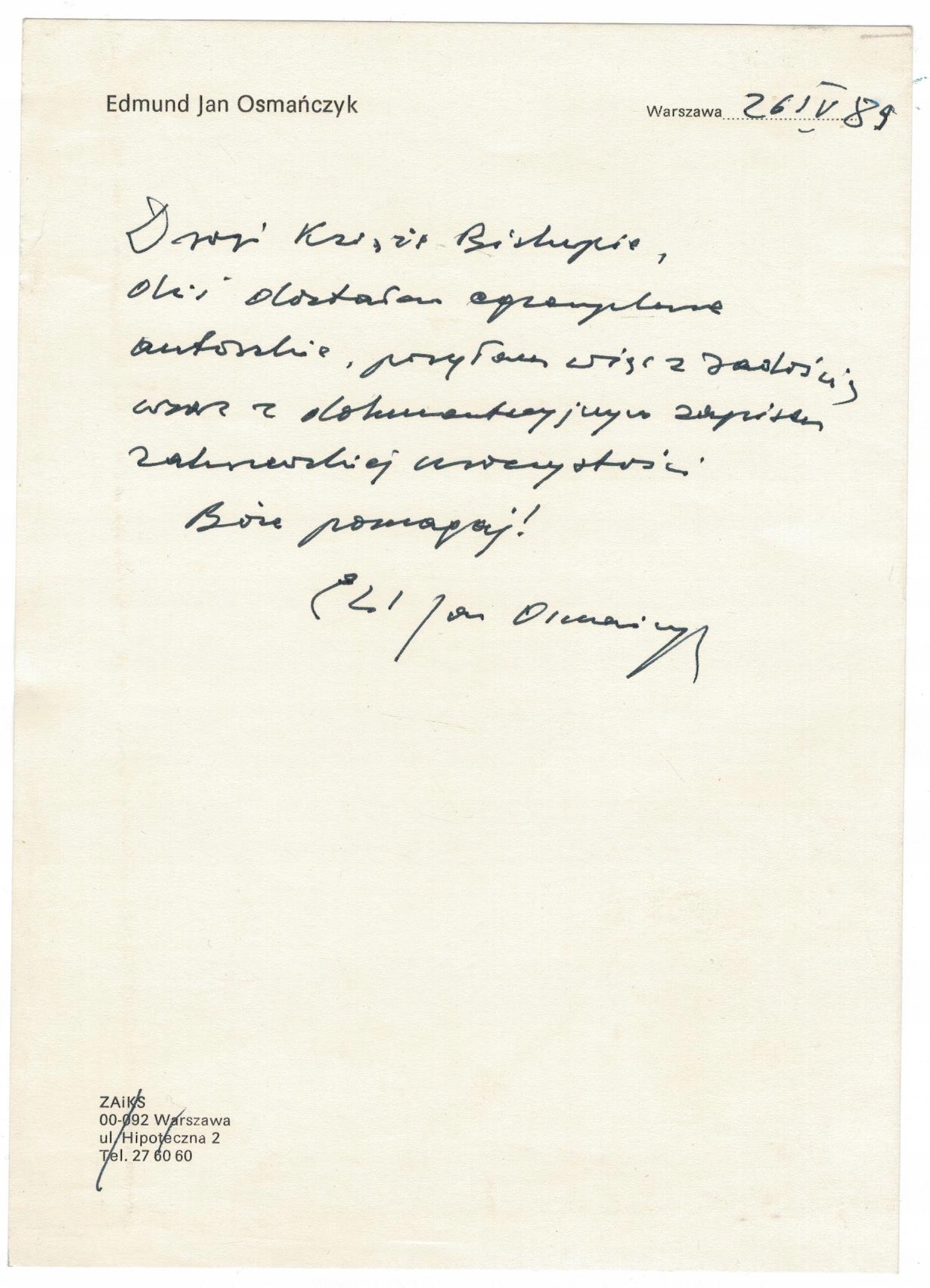 List odręczny 1989 do biskupa Alfonsa Nossola