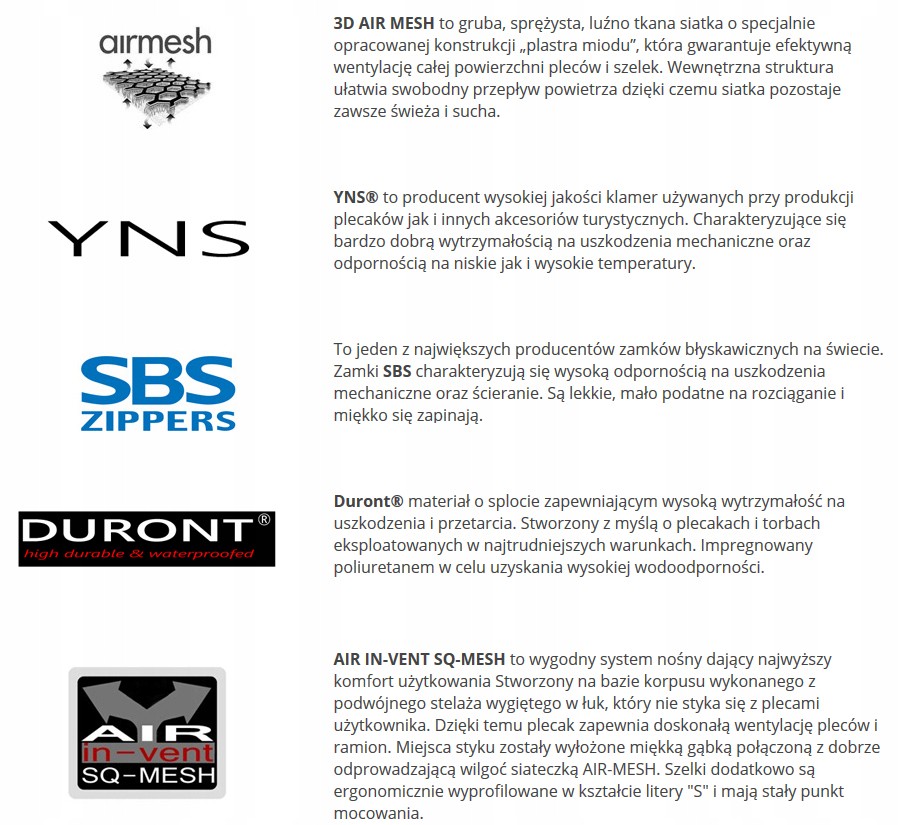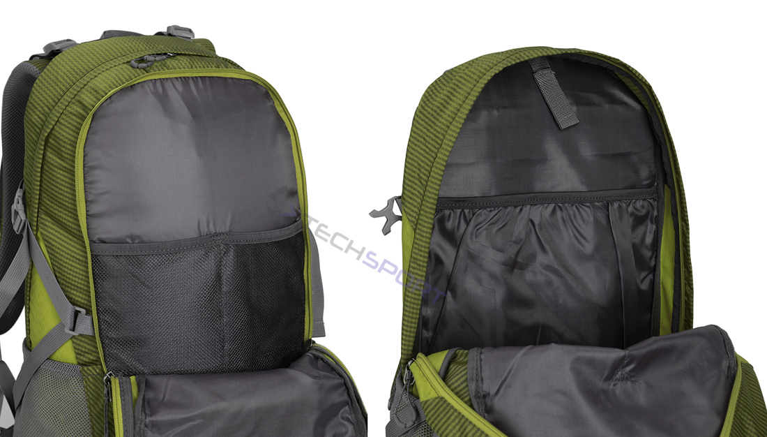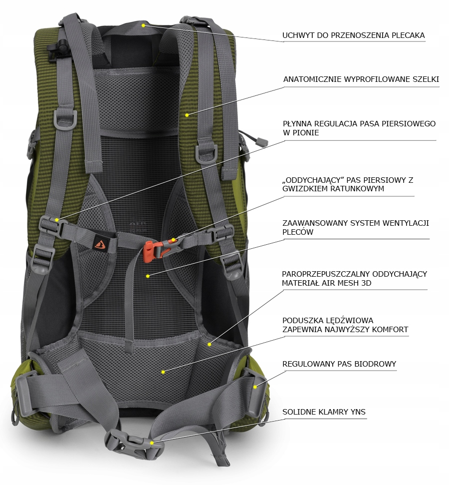 Plecak posiada wysoce oddychający system nośny oparty na metalowym stelażu wygiętym do środka oraz rozciągniętej na plecach siateczce. Na dole jak i na górze pleców zastosowano dodatkowo komfortowe poduszki wyłożone siateczką AIR-MESH. System nośny wraz z pasem biodrowym można odczepić. Zyskamy wówczas mniejszą masę plecaka, większą pojemność, możliwość zwinięcia plecaka. Wymiary plecaka bez pasa biodrowego i systemu nośnego odpowiadają również wymiarom bagażu podręcznego: