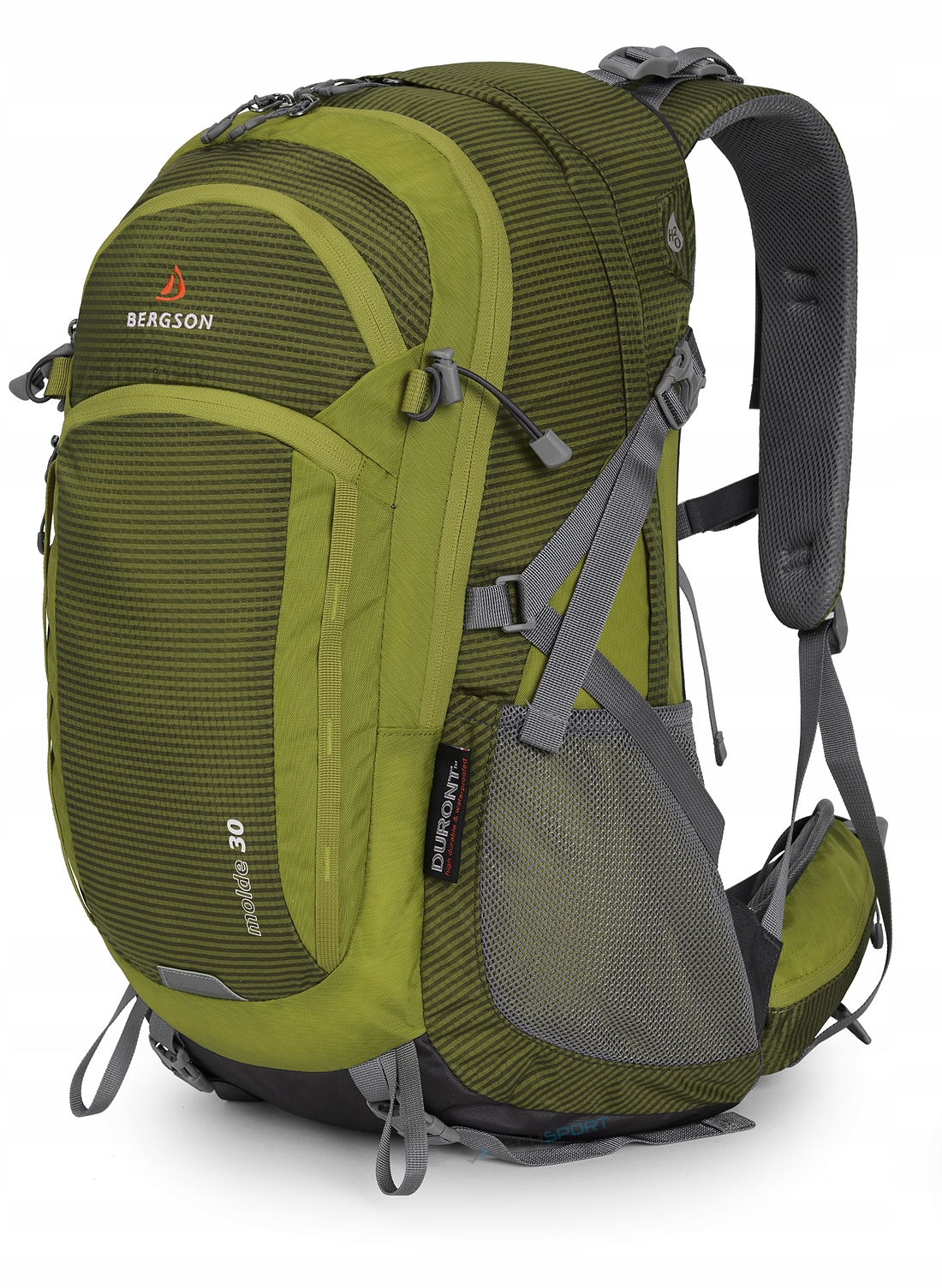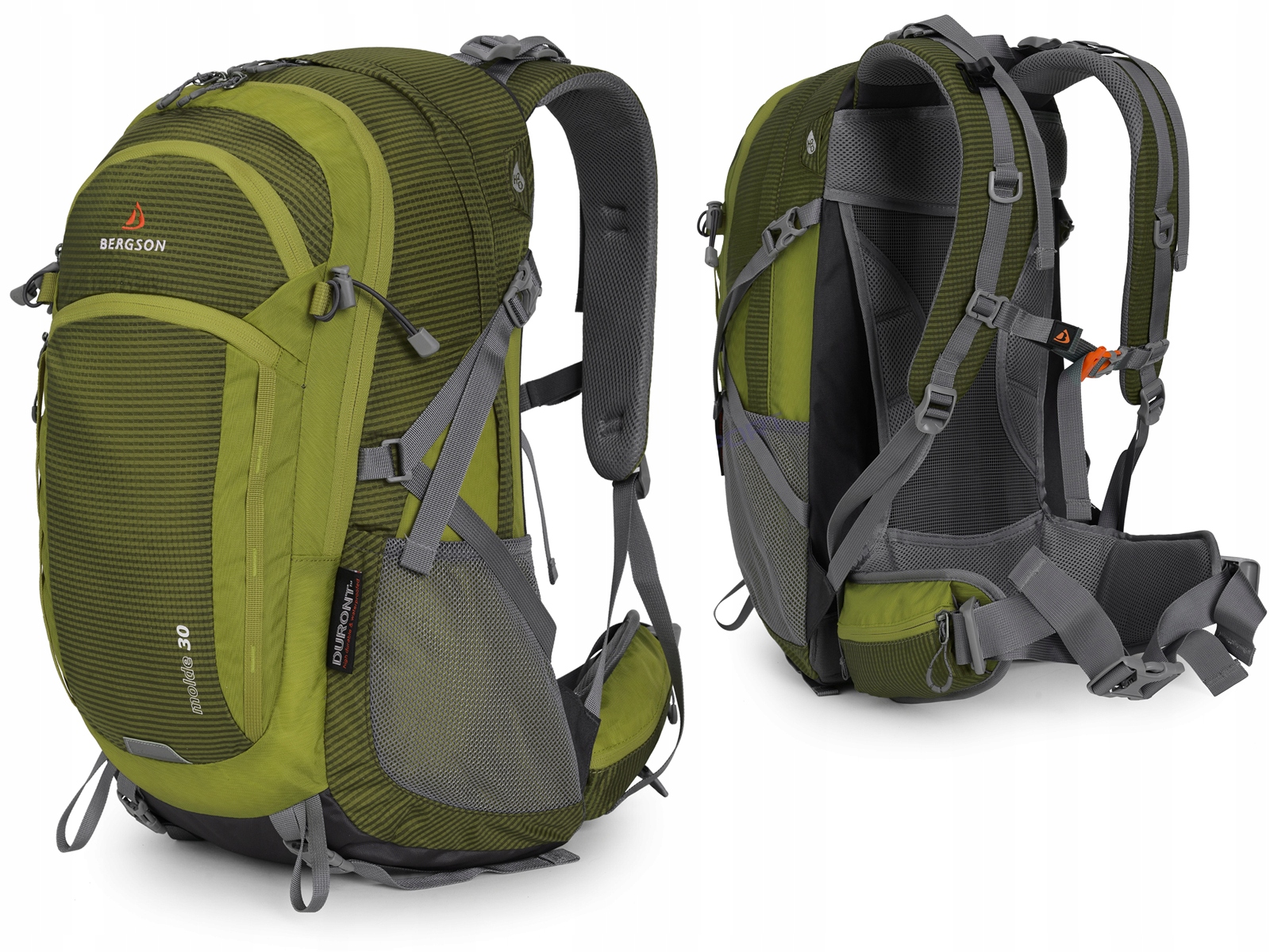 Komfortowy bardzo pojemny plecak firmy BERGSON o innowacyjnej budowie systemu nośnego. Model Molde sprawdzi się zarówno podczas wycieczek w góry oraz jako plecak miejski czy nawet plecak szkolny. Posiada wygodny pas biodrowy oraz pas piersiowy stabilizujący plecak na ramionach z wbudowanym w klamrę gwizdkiem ratunkowym. Dzięki dodatkowej kieszeni wewnątrz plecaka oraz specjalnemu otworowi, został on przystosowany do montażu bukłaka (oferta pasujących bukłaków znajduje się na innych naszych aukcjach). Plecak posiada również możliwość przytroczenia kijów lub czekana. Dzięki systemowi nośnemu AIR IN-VENT SQ-MESH® z anatomicznie ukształtowanymi szelkami w kształcie litery "S", plecak bardzo dobrze się nosi, jest wygodny i nawet po długiej wędrówce nie będziemy czuć zmęczenia. Bardzo solidnie wykonany i dobrze wykończony - dopracowany każdy szczegół. Wykonany z najwyższej klasy materiałów: Honeycomb Rip-Stop Duront® - bardzo wytrzymała, a zarazem lekka tkanina o strukturze plastra miodu, wzmocniona dodatkowo poprzez dodanie dodatkowego, mocniejszego włókna. Dzięki użyciu siatki AIR-MESH na szelkach oraz na poduszkach systemu nośnego, plecak umożliwia swobodną cyrkulację powietrza. Plecak charakteryzuje się dużą stabilnością oraz umożliwia komfortową eksploatację nawet w ciężkich warunkach przy dużych obciążeniach.