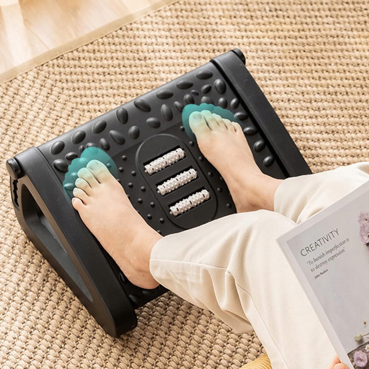 Powierzchnia podnóżka wyposażona jest w specjalne wypustki, które zapewniają delikatny masaż stóp. Dzięki temu możesz zrelaksować się podczas pracy, poprawiając krążenie i redukując stres.
